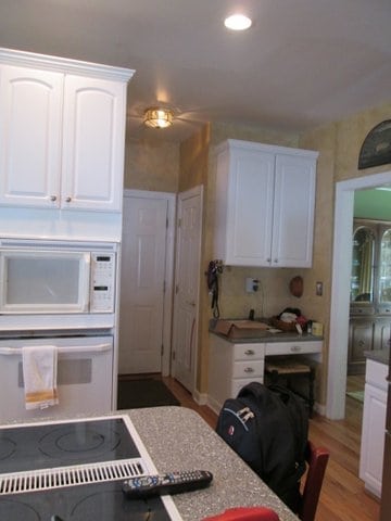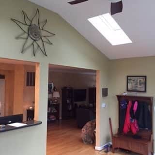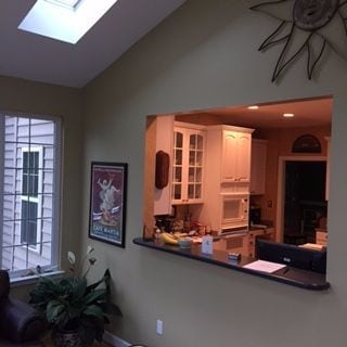 To add to the abundance of natural light through the wall of windows in the sitting room ELK Mercury Glass pendants were installed over the peninsula. The kitchen is adorned with a very functional and beautiful Kohler Apron Sink and faucet and a beautiful focal point over the stove of Moscow Petite Morning Rose and Calacata Ora. The clients are pleased with the completed project and the space looks much larger with a more efficient traffic flow.
