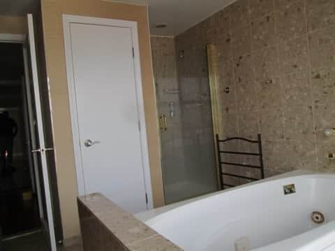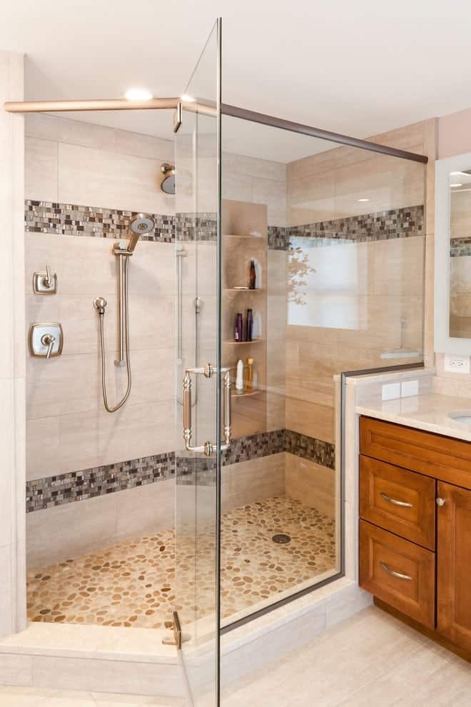Master Bath Stax Beige 12 x 24 shower wall tile Shower Border- masterpiece artifact glass & slate Bath Floor -12 x 24 glazed Porcelain stax beige Cosmos handshower, Kohler Marguax shower trim, Kohler mastershower Kohler caxton sinks-2210 -white sinks Botticino Vanity tops Dura Supreme Cabinets