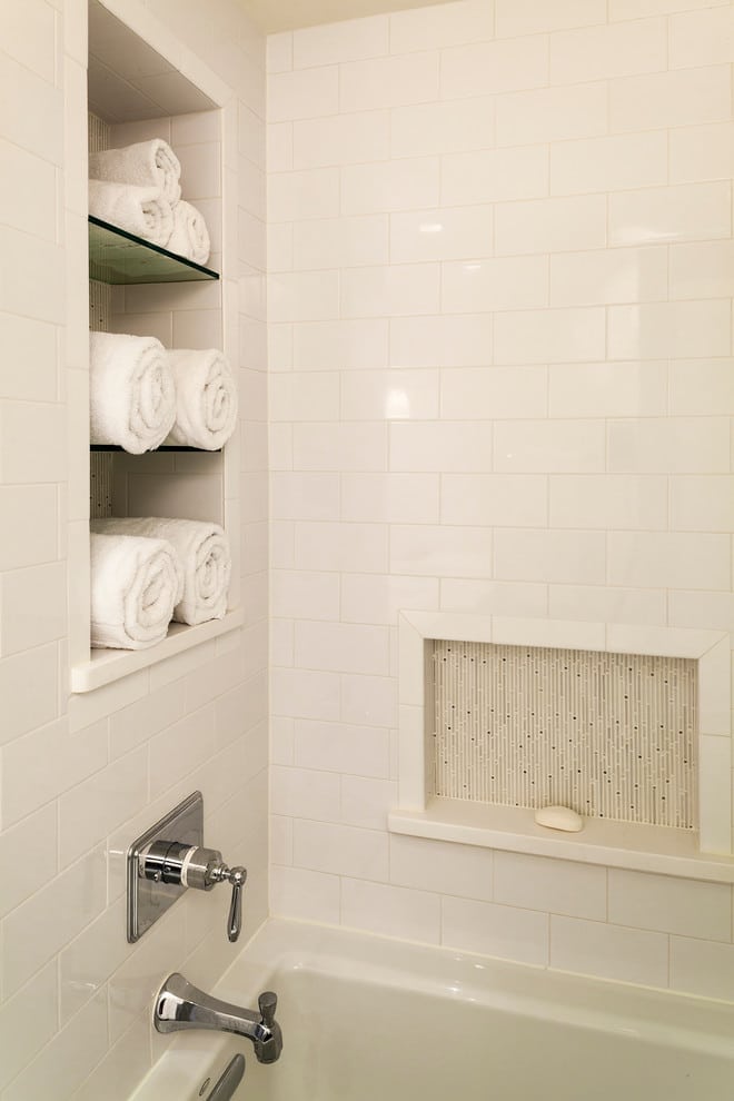 The master bath floor plan needed to flow better and the windows had to be replaced due to their draftiness, so we also included heated tile floors to reduce the chill. There were some changes with closets, so that interesting niches were created to add storage.
