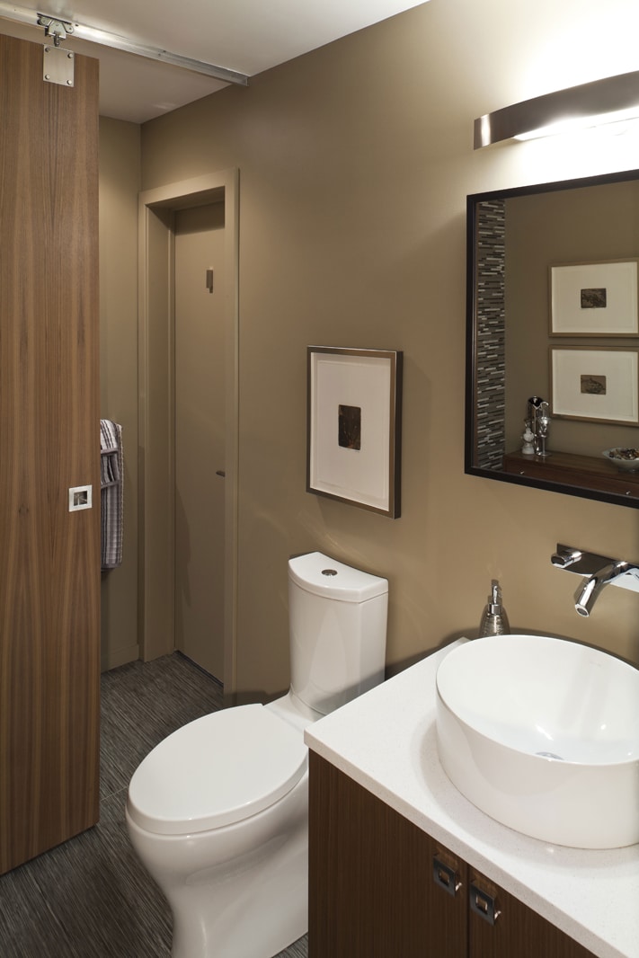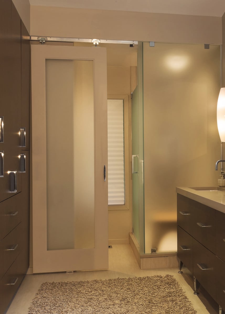 Beauty and the Beast? These new and improved doors have made their way into homes all across the country. Their humble heritage, keeping the livestock in, has become a trendy way to close off a room or stairway or even a shower stall. The barn door concept offers heavy duty metal hardware with a wood, but can be metal, a door that slides horizontally. These doors are great when opening a wall for a pocket door isn’t feasible or cost prohibitive, but can’t afford the space for a door to swing, as in a small bathroom. Perhaps you have a very large opening that needs to be closed off at times for quiet, as in this theater room, and you don’t want to have a wall of doors.