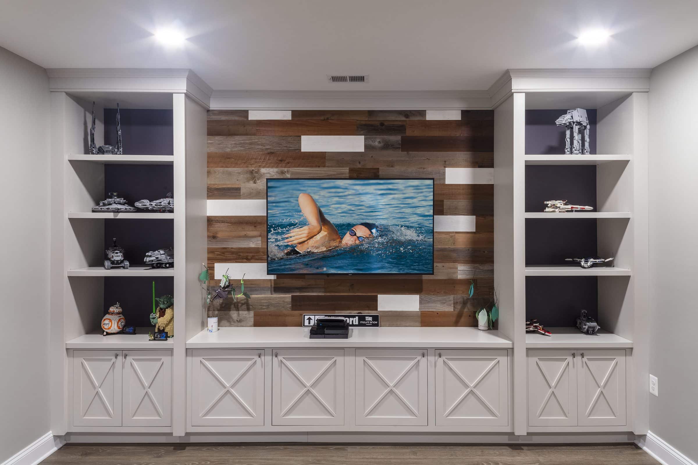 Work with a professional space planner to incorporate your dream basement into the allotted space. Keep in mind the fewer walls or partitioned areas the more space you have to work with. Framing and drywall will take up space when dividing your area that could otherwise be used for your family fun. As in the client’s basement images above they chose an open floor plan so that the entire family could enjoy being together while doing separate activities.