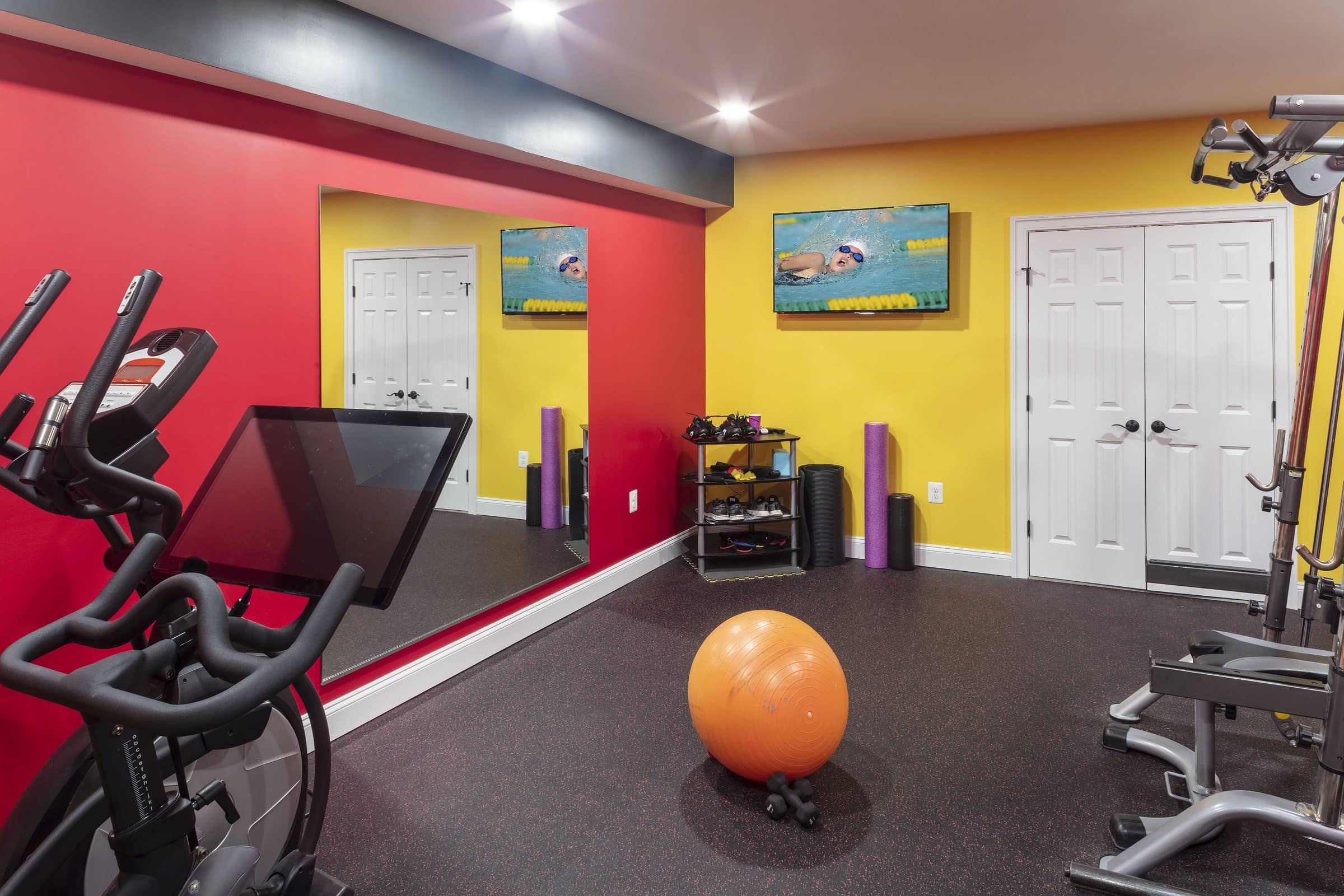 With this in mind, there may be certain activities you wish to be more private. Several such areas could be a home gym or home office. These are great additions to a home and can be included in your basement design. Another area would be a gaming room for the kids (or adults) where the noise level could be prohibitive. In the images below you can see where this same homeowner chose to incorporate both a home gym and a game room in separate areas.