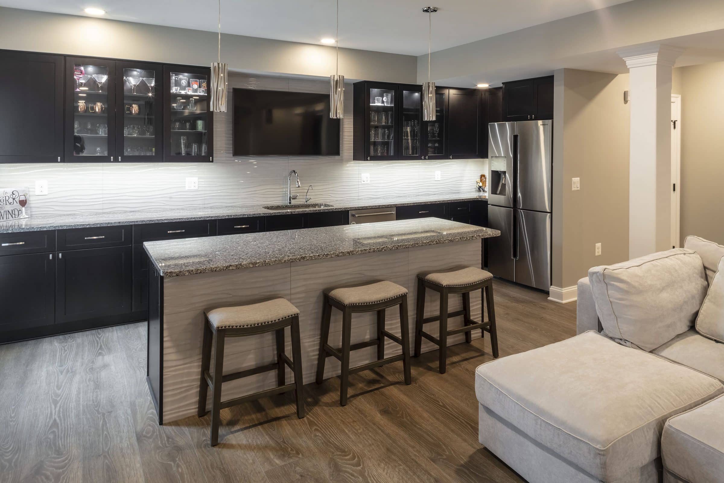 Think of the elements you wish to have in your remodeled basement and how you want them placed. This client chose an open concept that includes a pool table and a small beverage center for the adults to enjoy as well as a drink rail. The television seating area can be enjoyed by all ages and due to the open concept offers participants in either space to visit with one another. Even the kitchenette with a seating island is incorporated into the plan and allows the basement to be a place for entertaining a large crowd. Meal prep and serving are easy and keep the hostess from running up and down the stairs to the main kitchen.