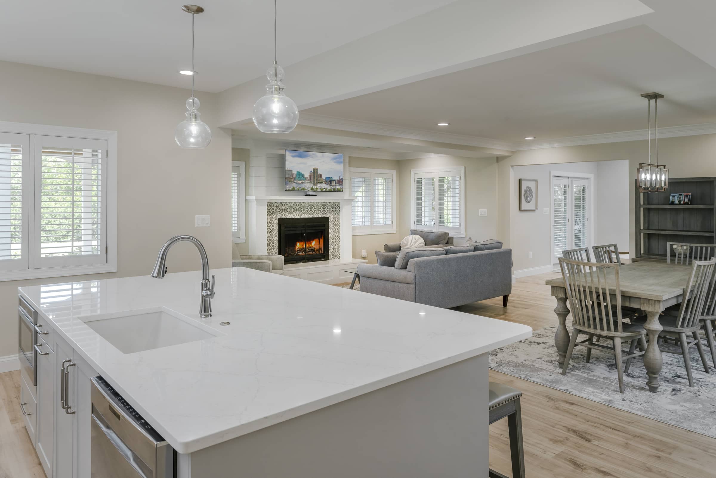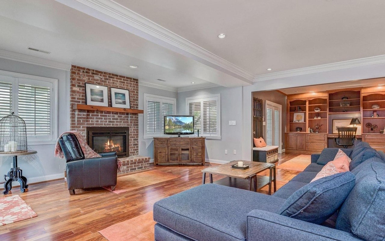 Choosing to create an open floor plan offering plenty of room for entertaining. The many windows bring abundant natural light, dispelling the usual dark and dank basement atmosphere. The kitchen, living room, and dining area are incorporated into an open-concept design but separated strategically to give the look and feel of three separate living areas. This couple also has an independent study for quiet contemplation or a home office—and many amenities, such as a roomy pantry, laundry room, gas fireplace, and guest bedroom.