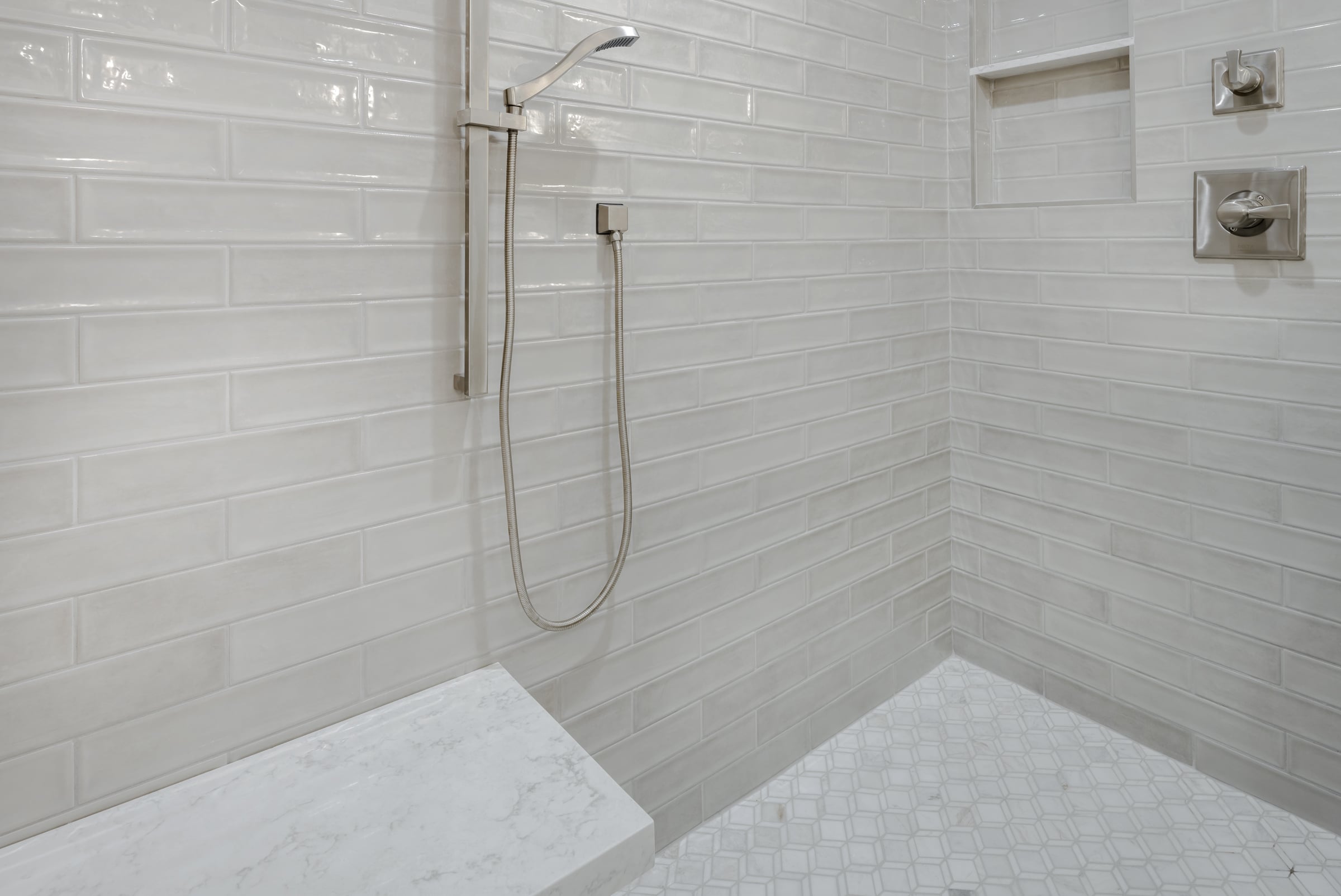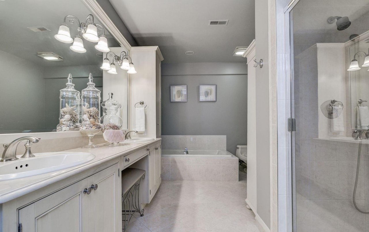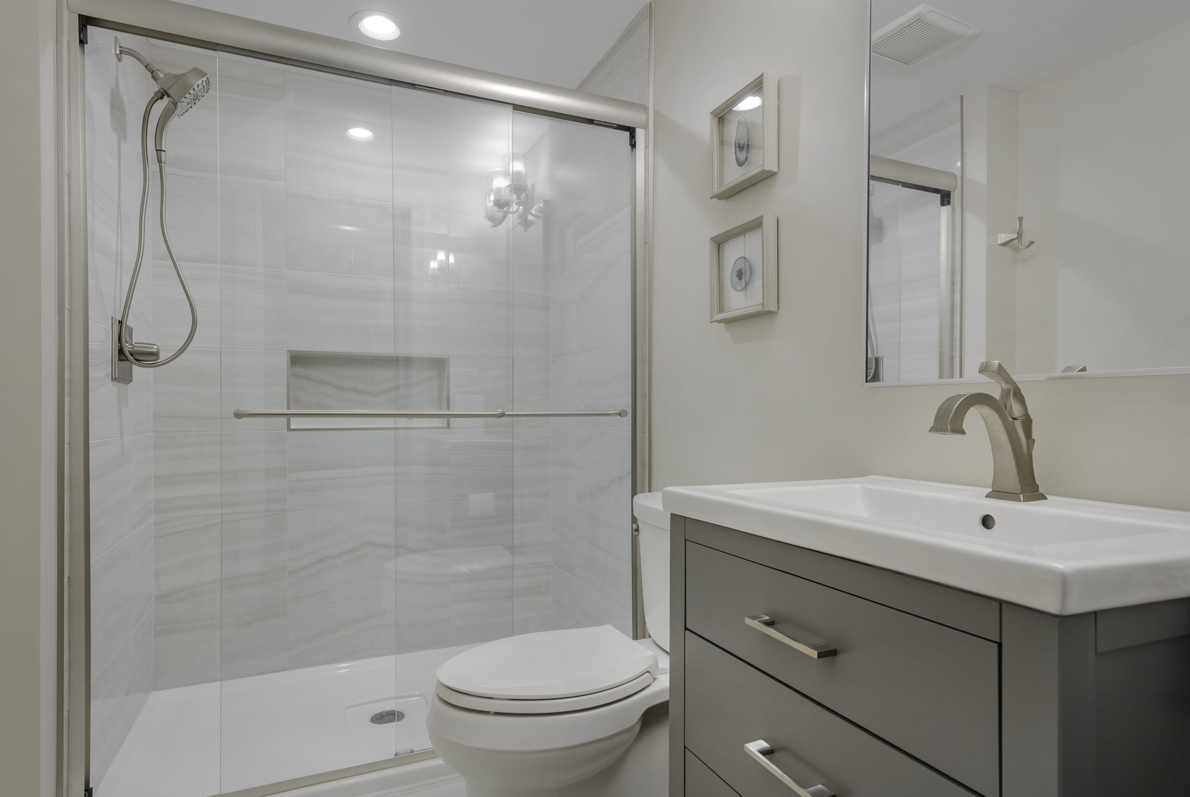 Since this basement is 2100 square feet, the apartment dwellers have a separate and privately located bedroom en suite. The en suite includes a large bedroom with a sitting area, a bathroom with double vanity, a makeup area, and a large floor-to-ceiling tiled walk-in shower.