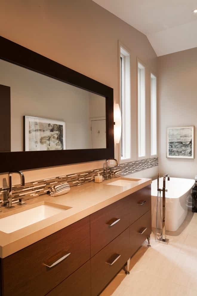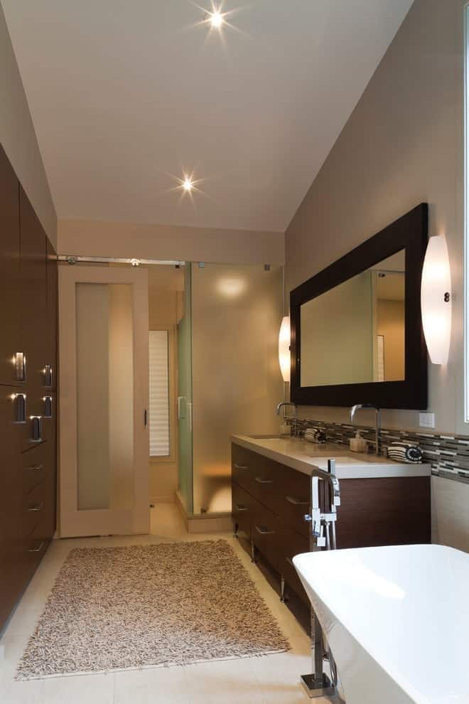 Owings Brothers delivered a completely fresh and contemporary remodel for the master and hall bathrooms in this Baltimore County home. The homeowner stated their vision of textured features among clean contemporary lines and Owings Brothers designers worked to make it a reality. Barn style glass and wood doors were paired with brass faucets, stone countertops and more to achieve the right balance in combination with warm lighting, paint color, and more.