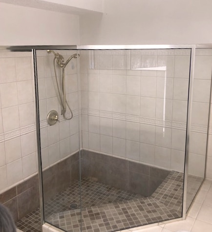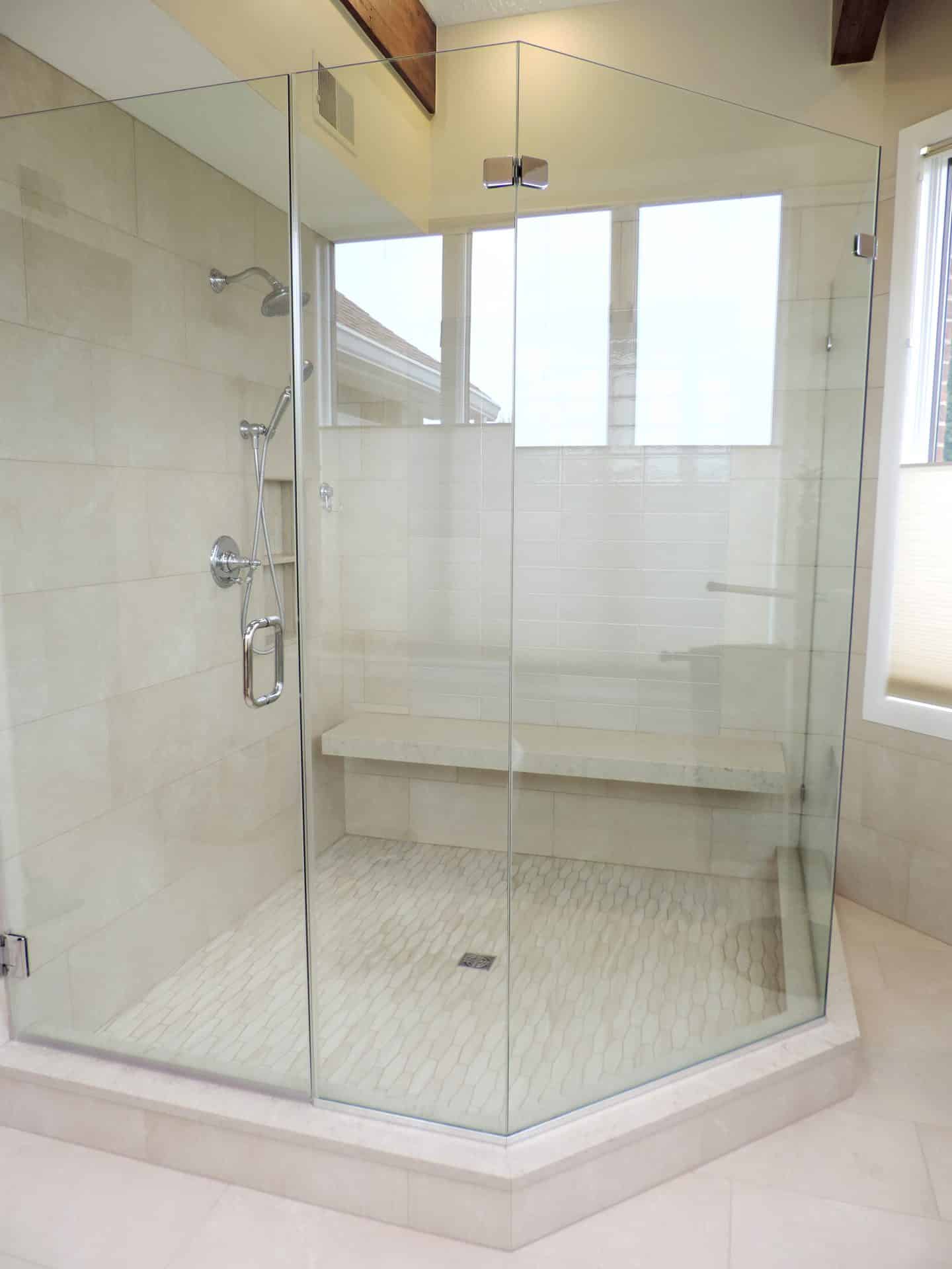 The walk-in shower was also updated to expand the area of the existing shower removing a wrap-around tile bench for a more compact floating bench. The dark tile was replaced on the shower floor with a neutral tile to coordinate with the rest of the tile in the balance of the bathroom.