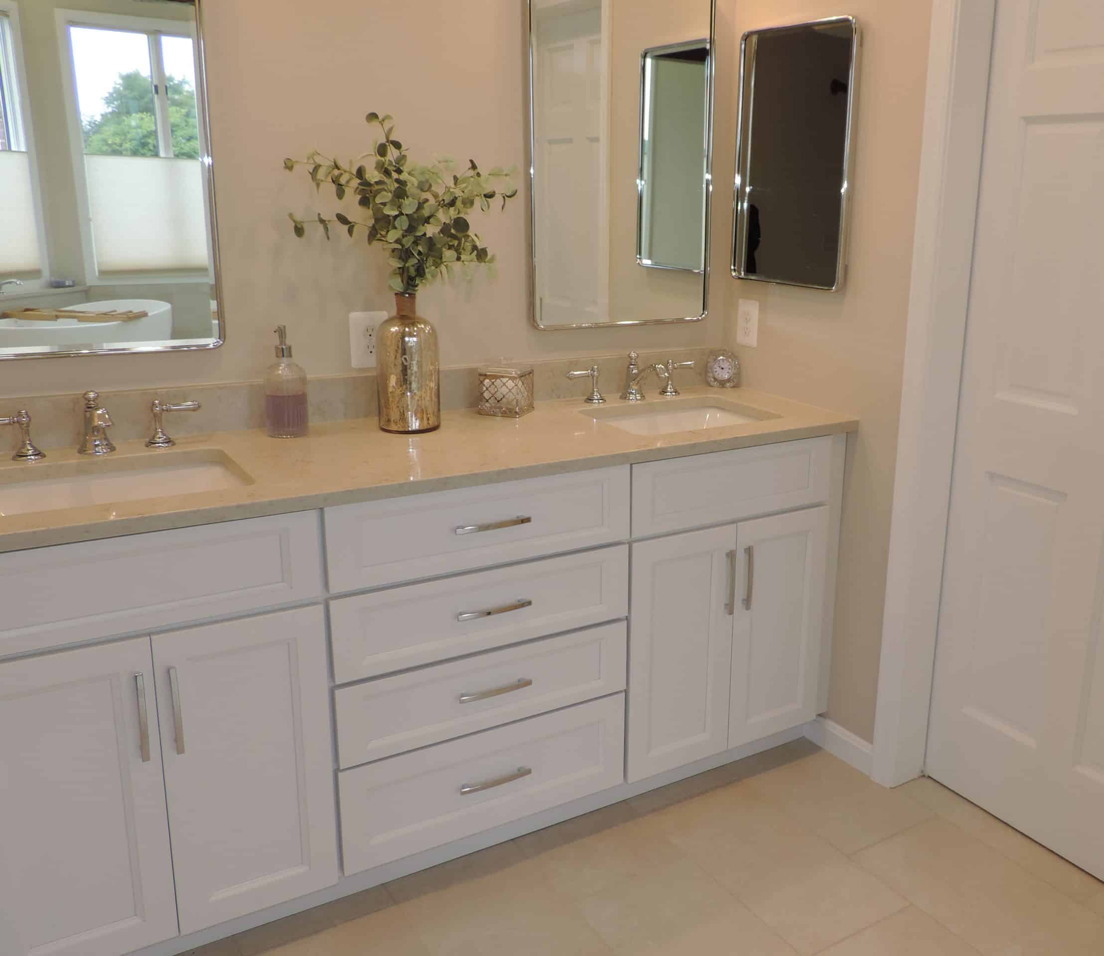 Another enhancement for this master bathroom update was to replace the outdated double sink vanity with a more modern unit. Choosing a furniture piece as a linen closet was ideal to create a warm and custom feel. Furniture-like cabinetry is a wonderful way to customize any bathroom in your home. Check out our blog post on Luxury Bathroom Remodel Ideas.