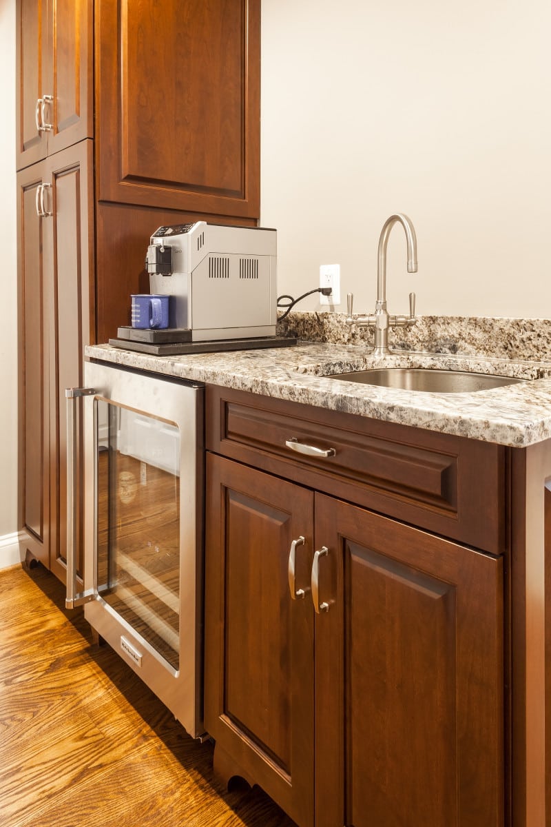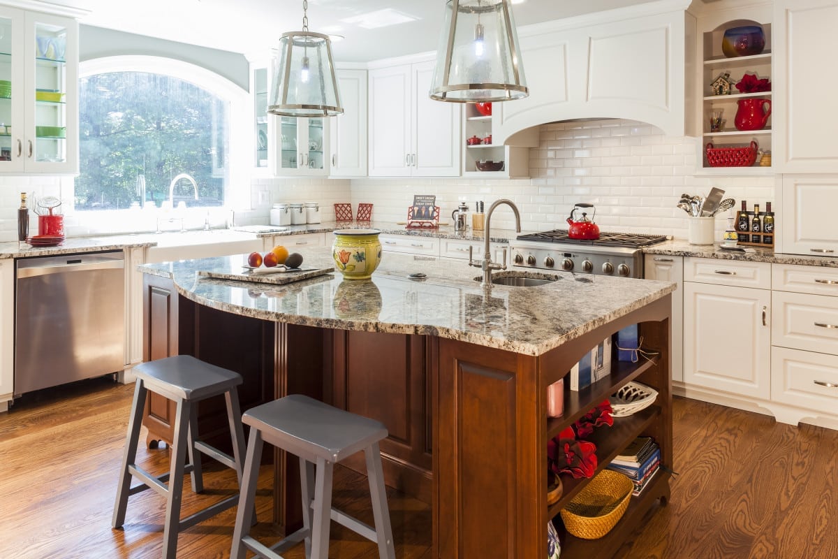 This homeowner wanted to expand their home with a two-story addition to offer a larger master bedroom suite, which includes a walk-in closet and increase the footprint of their kitchen and to incorporate an island with seating and a butler’s pantry. The kitchen design boasts white solid wood cabinets on the perimeter and stained solid wood island with Richelieu cabinet hardware in brushed nickel. Beautiful granite counter tops grace the cabinets in the color Blue Flower and are from Rock Tops Granite & Marble. The exquisite metal and seeded glass pendant task lighting for the island is from the Feiss Harrow Collection. All faucets are from Kohler, as is the White Haven farm sink. The bar sink in the butler’s pantry and island are from Artisan.
