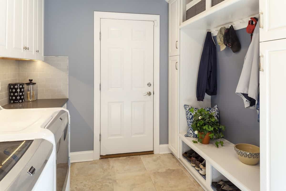 This classic kitchen is completed with white Diamonte subway tile and interesting open curio shelving and book nooks. Andersen windows were installed in this addition including the 400 Series Specialty Arch window over the farm sink and a large bay window for their herb garden joins the mud room and kitchen. To add to the efficiency of this new addition and a place to clean up the pooch after a long walk, the couple installed a mud room/laundry room adjacent to the kitchen with room for their coats, laundry and pet supplies.