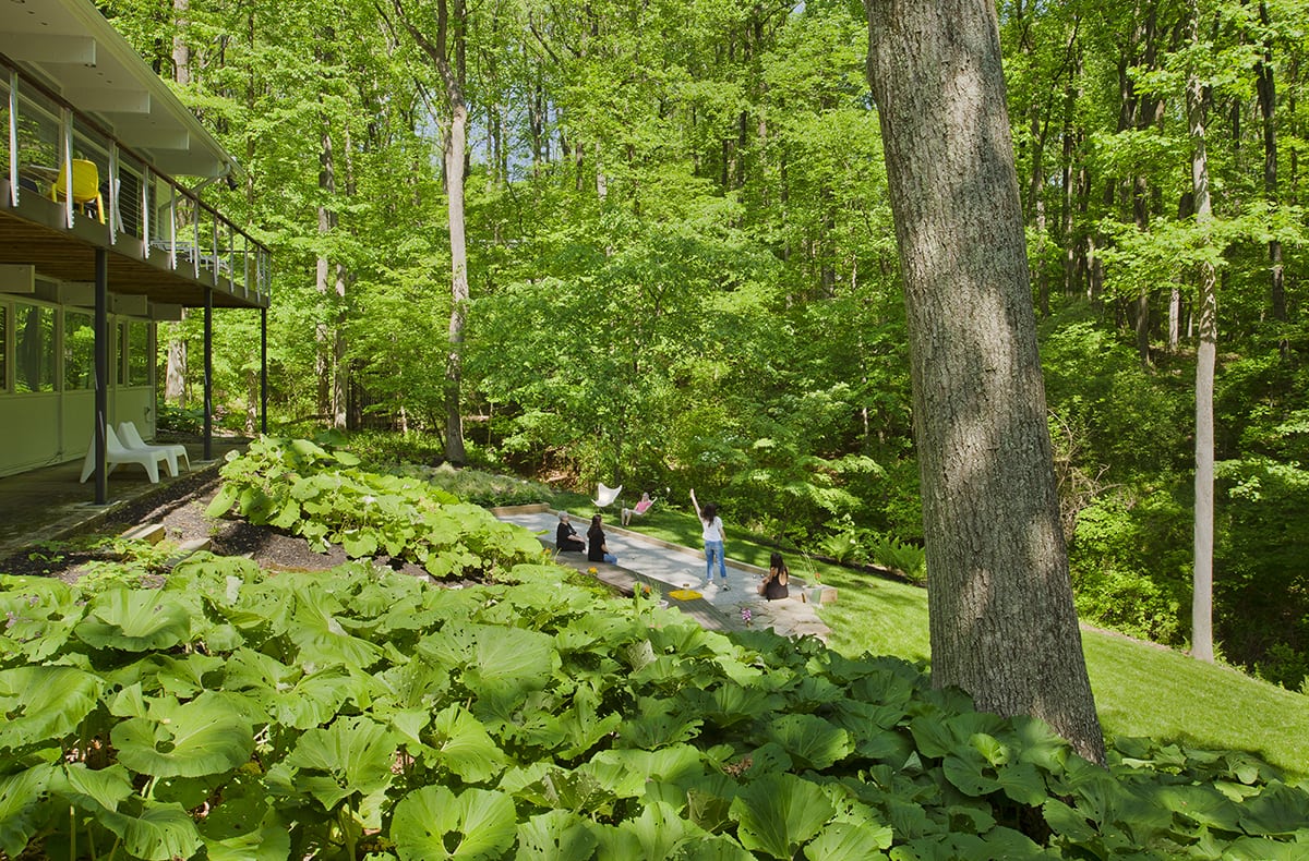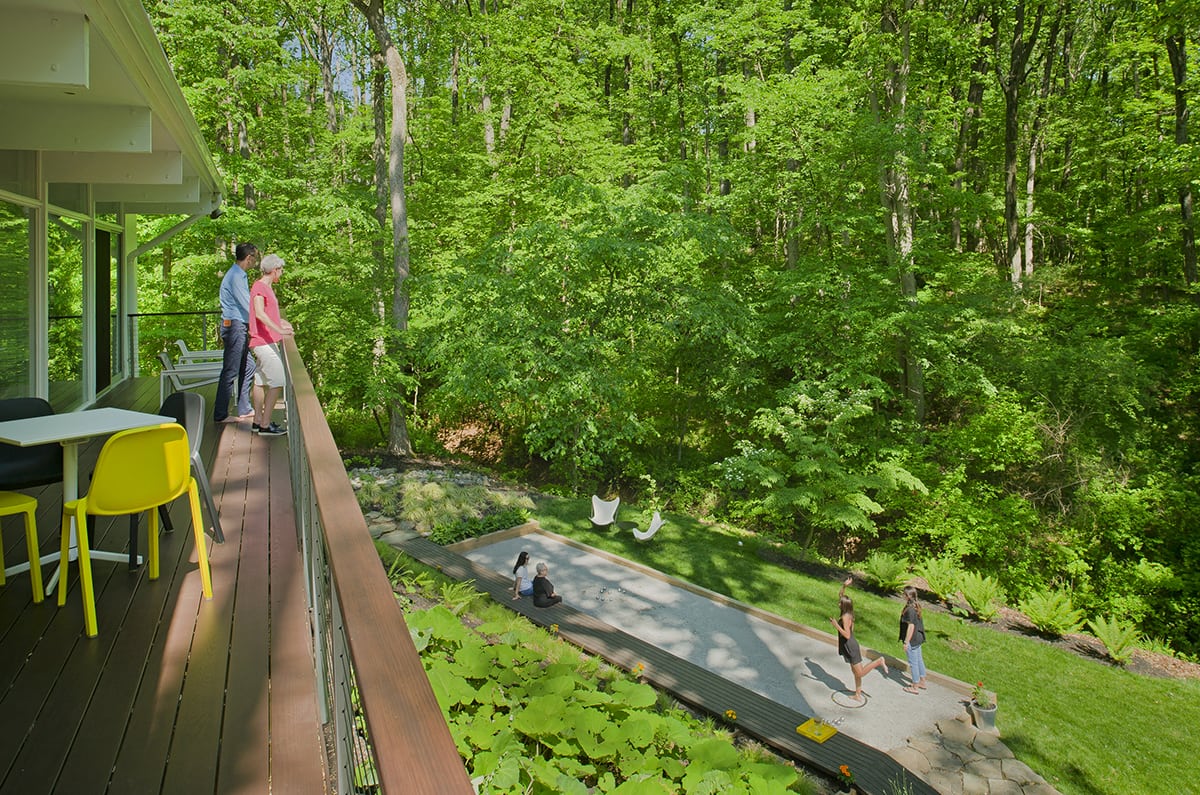 Built on the side of a hill, the home is surrounded by lush forest giving the feel of being in a tree house. The living and dining room open up with sliding doors to a balcony that runs 45 feet long, which is the entire length of the house. The balcony built by Owings Brothers overlooks the terraced yard and an area created to play a game of pétanque, a French ball-toss game similar to Bocce Ball.