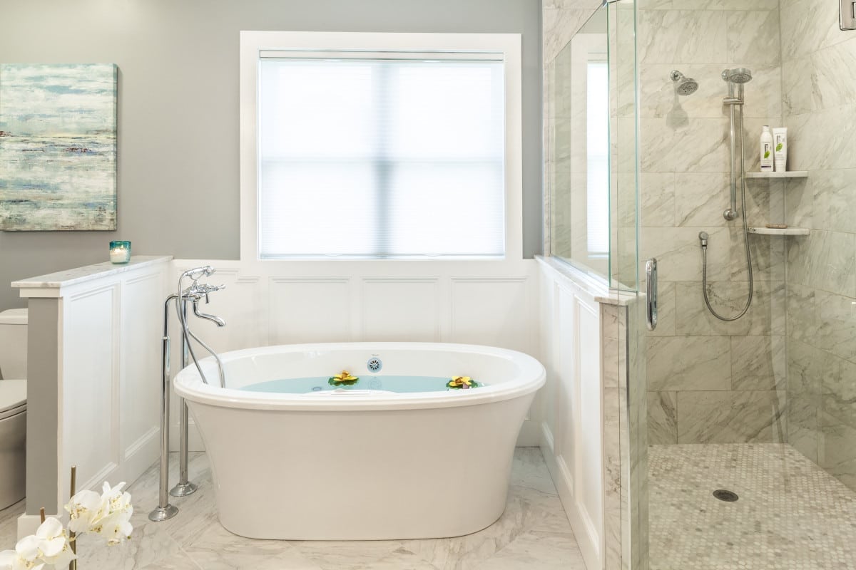 This beautiful custom home in rural Carroll County is situated on a high hill overlooking horse farms. The homeowners contracted with Owings Brothers for a custom Design/Build project. The team at Owings Brothers began architectural drawings to produce the house that would fit this family’s needs. A three-bedroom cape cod emerged from the earth sporting three dormers, a covered front porch, screened rear porch, two car garage, a finished basement, and a first-floor master suite with a master bath, which includes Carrara marble tops from Rock Tops and Carrera marble tile from Chesapeake Tile, Koch cabinetry, and Top Knobs hardware. Also, a Bain Ultra Sanos Thermasens freestanding soaking tub supplied by Thomas Somerville, with a Brizo tub faucet, graces this spa-like bath, and the home also includes two more full baths and a powder room. The home was built to allow first-floor living as this couple desired to age in place. The open floor plan allows for large gatherings of family and friends, and the kitchen includes an eight-foot island with Koch glass front cabinets, Rock Tops granite, and Richelieu hardware. The exterior was sided with CertainTeed Landmark Designer Series in Weathered Wood. Garden Architecture designed the outdoor living space, and Lazo Landscaping installed the Techno Bloc Blu hardscape in the rear of the home with Blue Stone seating walls, a fire pit, and a knock-out view to boot! Take a look …