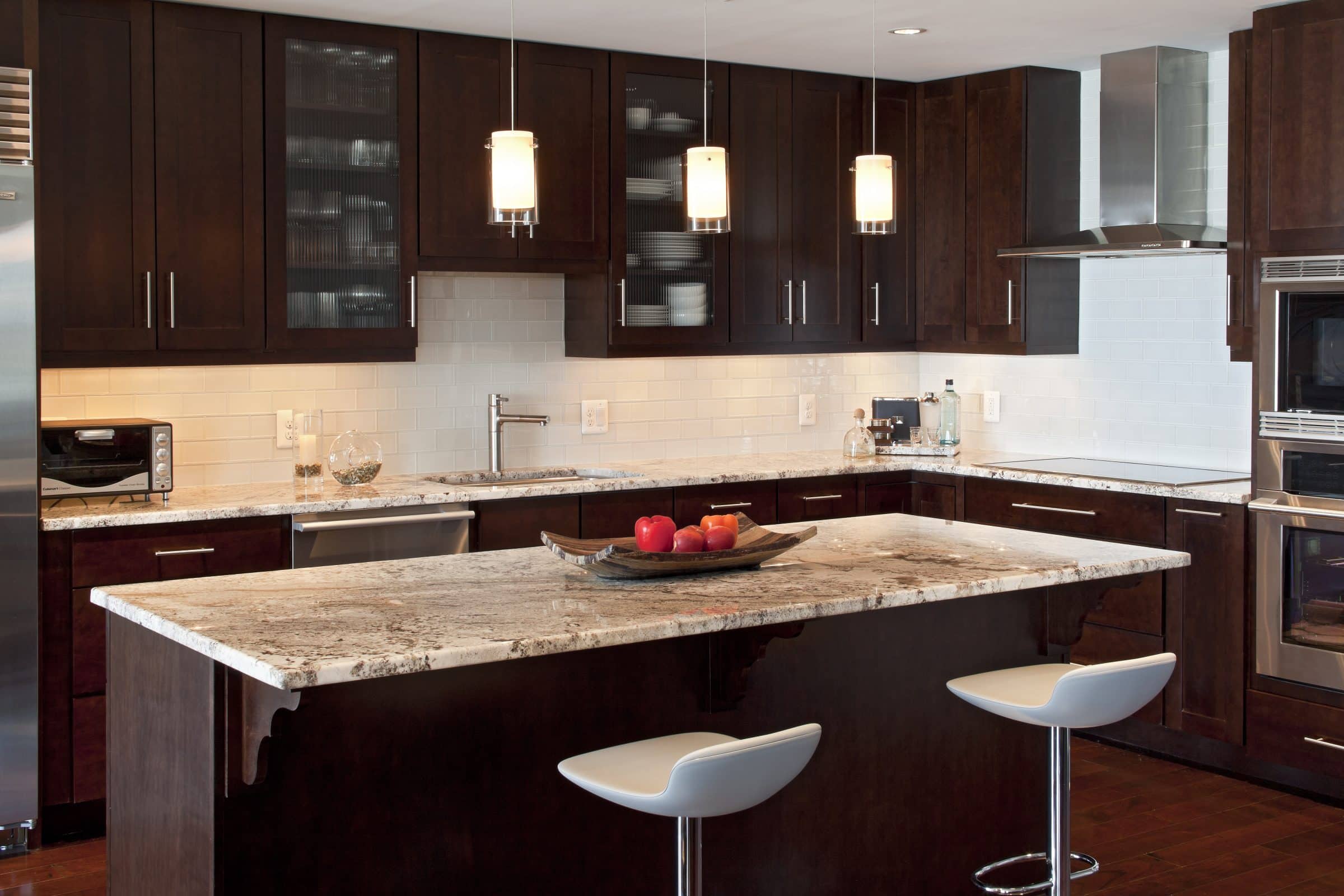 Dark kitchen cabinets can add drama and sophistication to your home. When choosing dark cabinets keep in mind that they will especially stand out against light colored back-splashes or counter-tops and light color painted walls. To bring a bold look to your kitchen choose dark cabinets to add stunning beauty to this space.