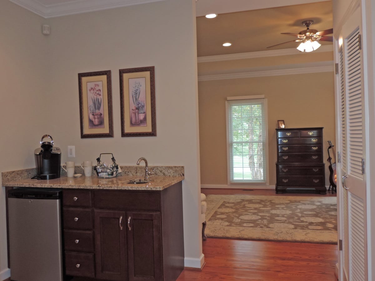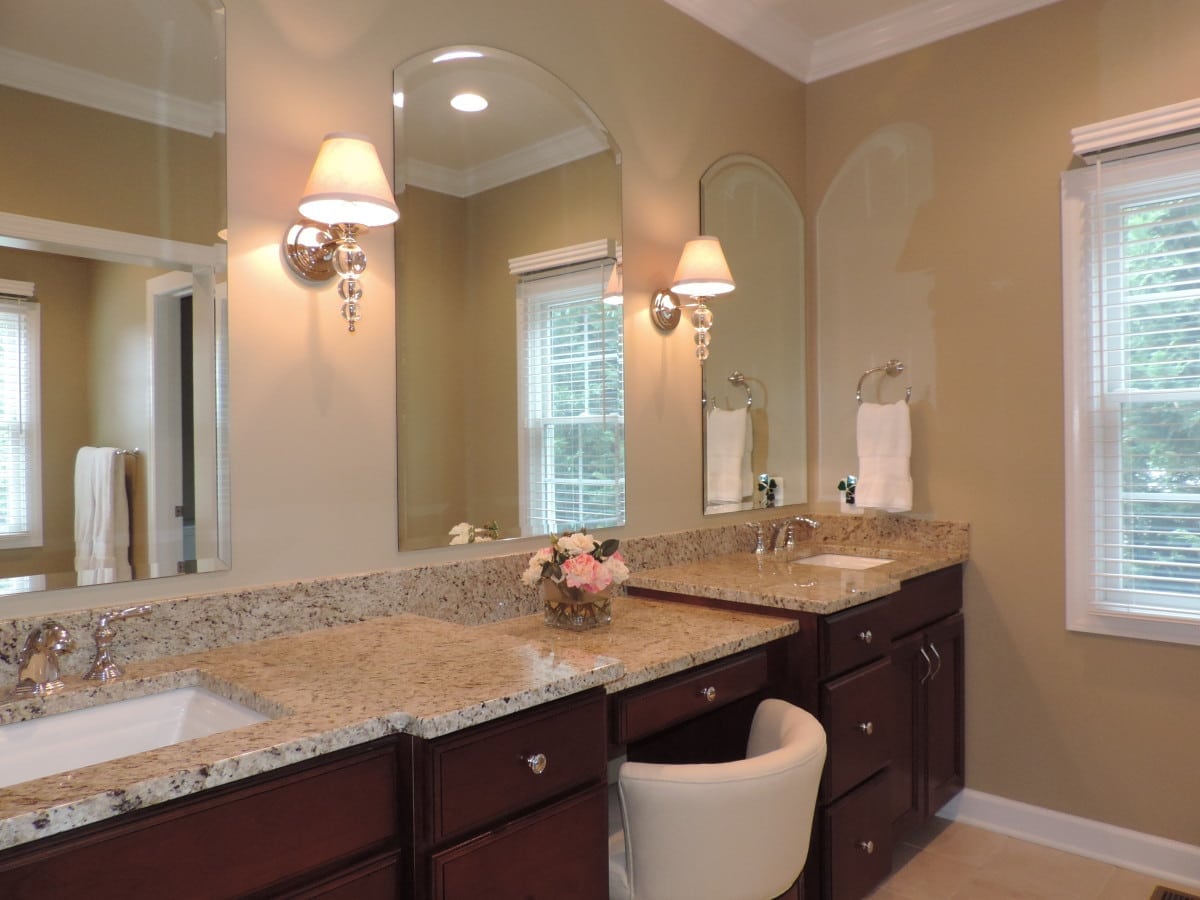 This Howard County homeowner created a master suite addition for their private get-away. This beautifully decorated addition offers a master bedroom with a tray ceiling, lots of natural light, a large master bathroom with double vanity and makeup area and large tiled walk-in shower with shower bench. This master suite also boasts a coffee/wine bar and two walk-in closets with beautiful and efficient wood closet systems. The pièce de résistance is the private entrance/exit covered veranda for quiet moments in their beautifully manicured back yard.