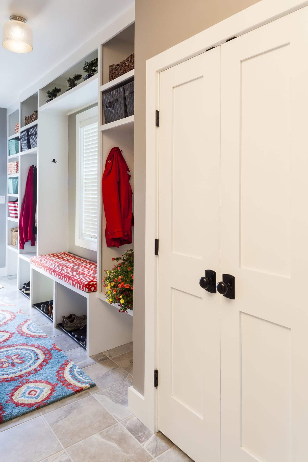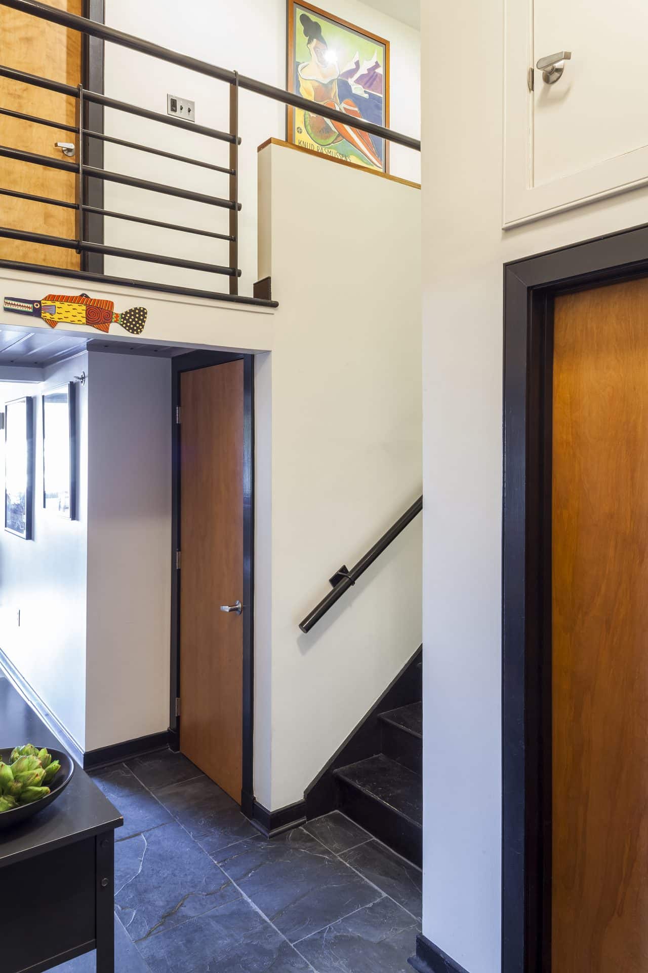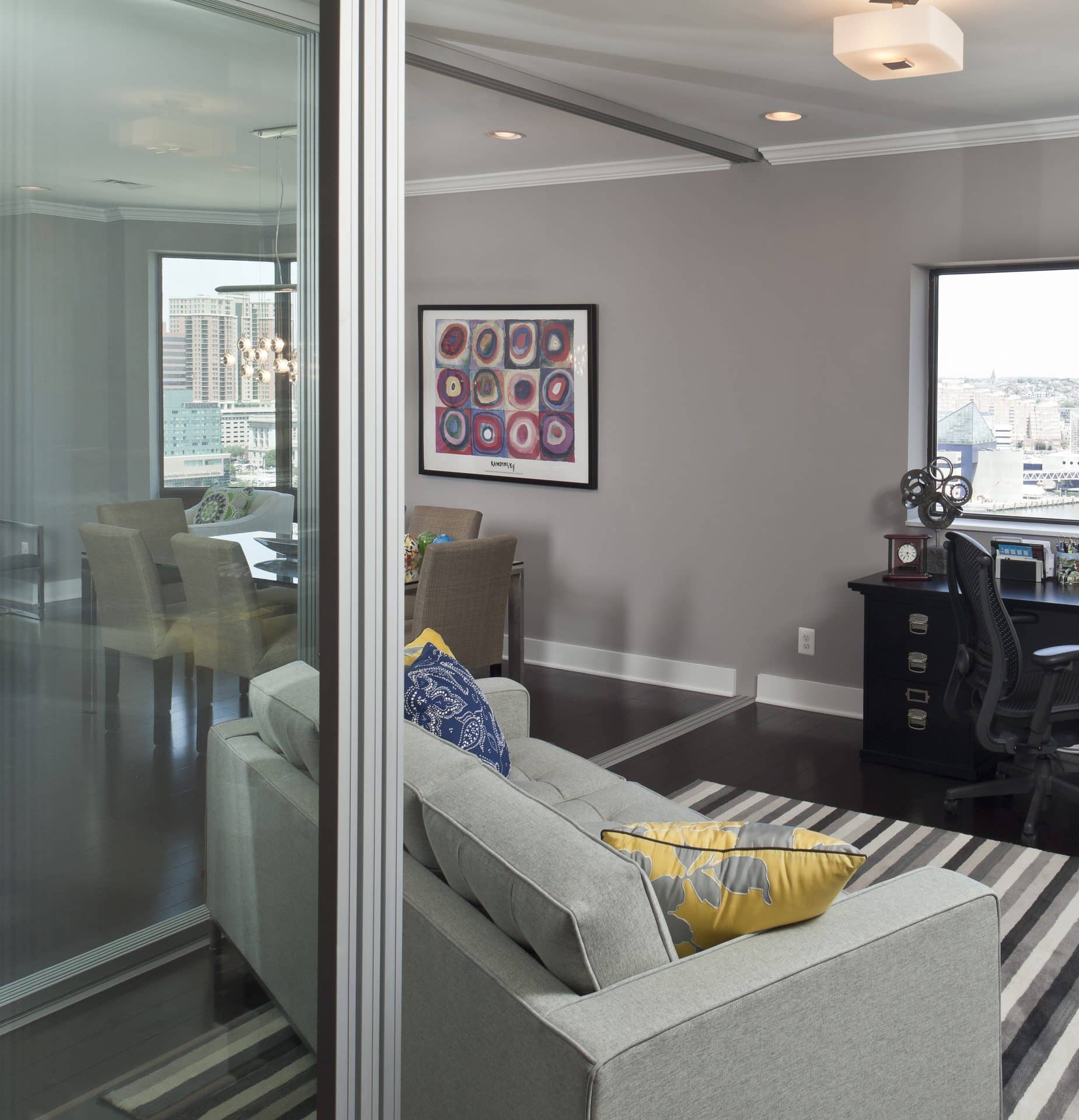 Add texture and color to any room you choose by creating doors that pop or blend in. Do you want doors that stand out then choose a texture and or color that contrasts with the wall on which it is hung? Does your taste run more toward the clean lines of the contemporary? Take a look at the doors in this high rise condominium in Baltimore City below. Our client preferred that the doors just go away. Floor to ceiling height these very tall doors blend with the wall in color and with the press and close latches are barely recognizable as doors!