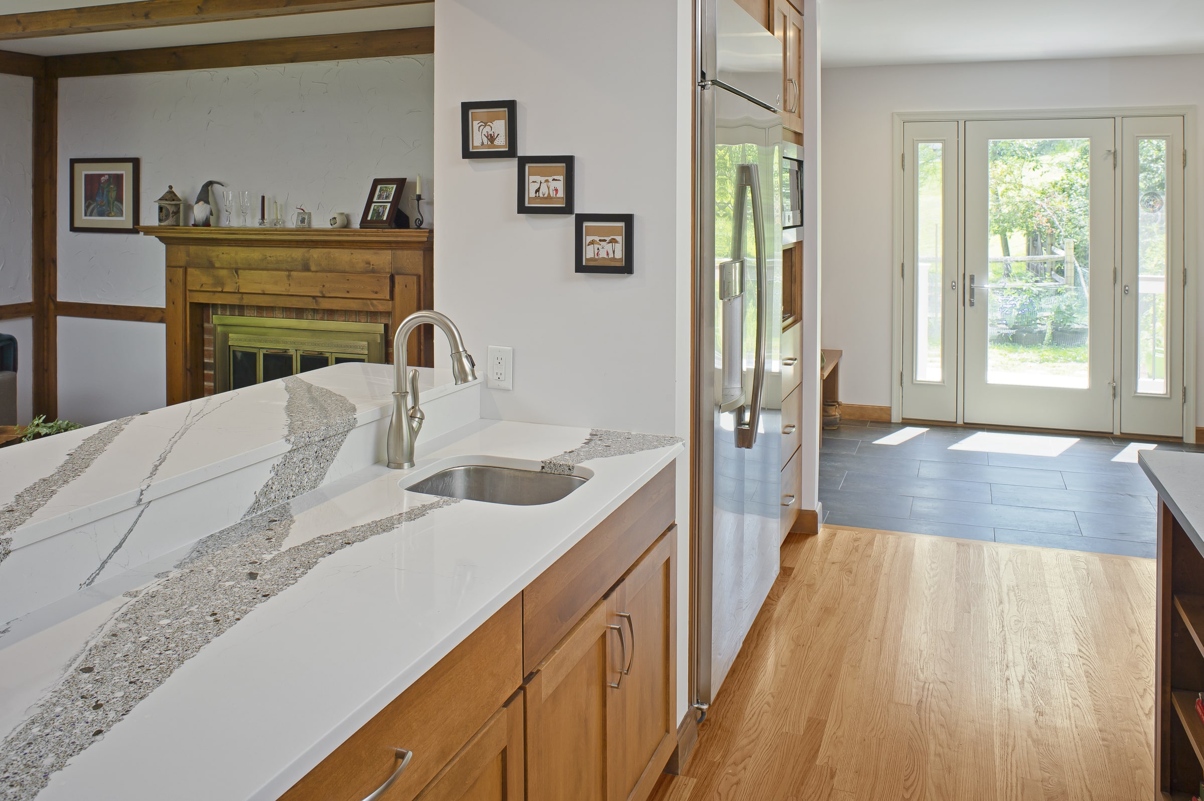Shaker Style stained finish cabinets were chosen for our kitchen and mudroom remodel by Koch Cabinets. Wood stained in warm hues provides balance to the white surface that surrounds them on the countertops and walls. This new floorplan allowed for many more cabinets than was originally in the home. We increased even more storage space with easy access to the mudroom. The hardwood flooring in all the first floor was stained in the same warm tone as the cabinetry.