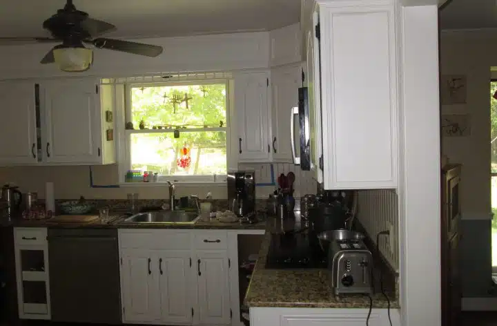 As you can see a dark and dingy kitchen with very little natural light has been completely transformed! Owings removed walls on all sides of this kitchen. We expanded the gathering space to include a dining room, family room, and mudroom. The reconfiguration allowed for better flow for the first floor and much more light. Windows from the adjacent rooms now spill natural light into this busy kitchen workspace. To bring continuity to the first floor of their home a natural hardwood floor was installed. Large surfaces such as the countertops and walls were chosen in light colors allowing light to reflect over the entire surface.