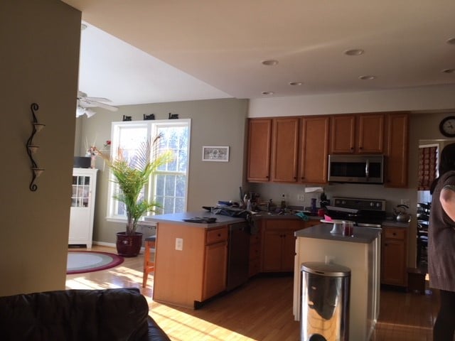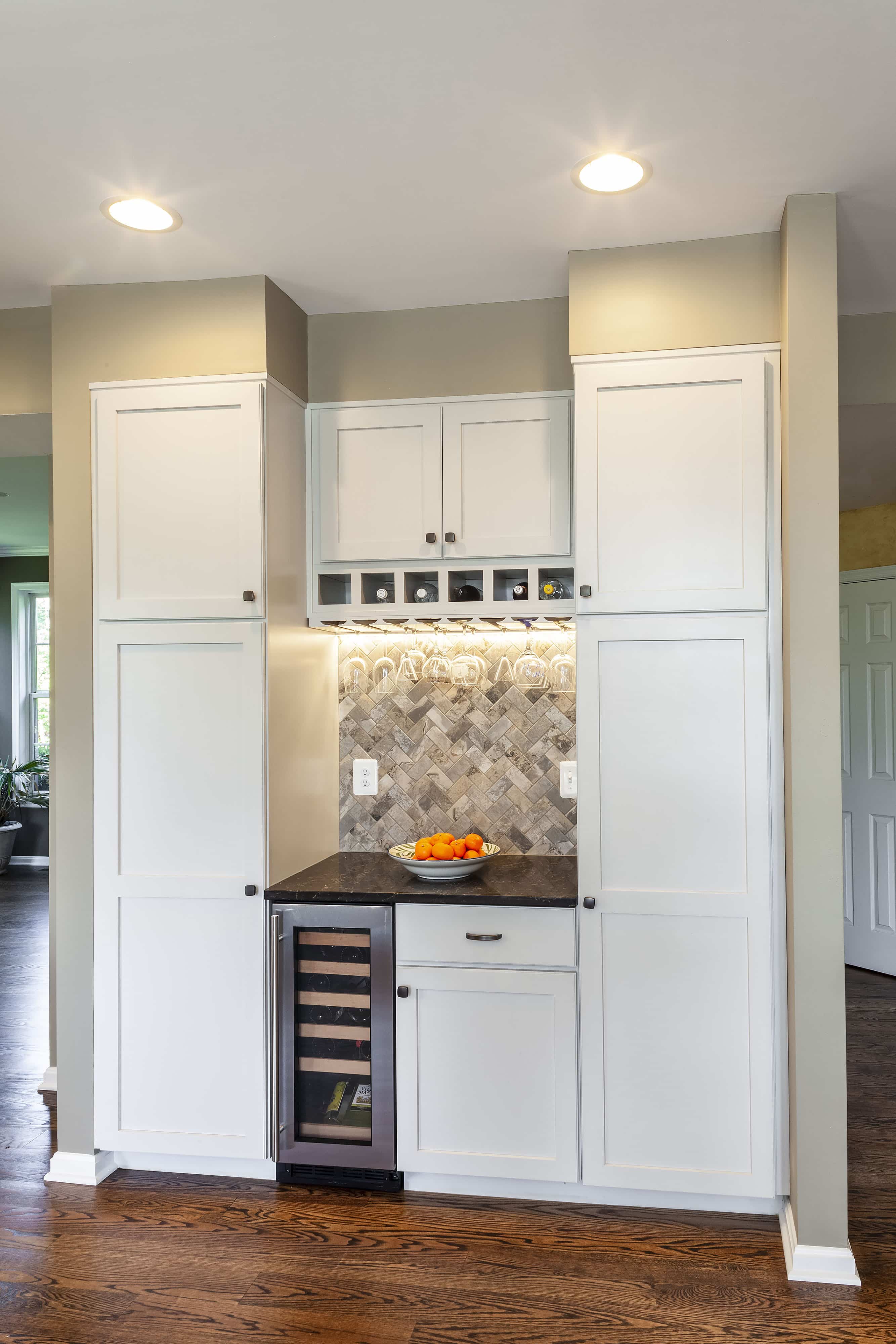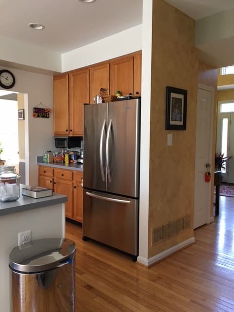 Our Eldersburg MD homeowner chose to increase the footprint of their kitchen by removing the wall to the adjacent dining room. The man of the house was also the chef and he wanted to prepare his delicious meals in an efficiently laid out kitchen with plenty of countertop workspace. The homeowners’ sizeable family gathered often for meals, so a dining room was necessary for their lifestyle. Owings’s solution was to remodel the living room open to the original dining room into the new dining room. The removal of the adjacent dining room wall enlarged the kitchen by 121 square feet and enabled the construction of a larger island. This kitchen dining room expansion provided room for the addition of a commercial size Wolf stove along with many more cabinets and counter space.