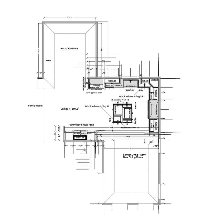 Our family chef chose a layout that would also enable him to move through the kitchen with ease and planned for the refrigerator placement and an additional trashcan at the end of the island. This enabled the family to move through daily functions without interrupting the chef in meal preparation. Their original kitchen plan hemmed the kitchen in by a peninsula and trapped everyone in the same area at the same time. Not an efficient layout for this cook and his family which is what motivated the remodel. The home was a relatively spacious one so adding to the footprint was not necessary and this dining room conversion was just the fix. Many homeowners find that staying within the footprint of their present home is doable and most definitely more affordable than constructing an addition.