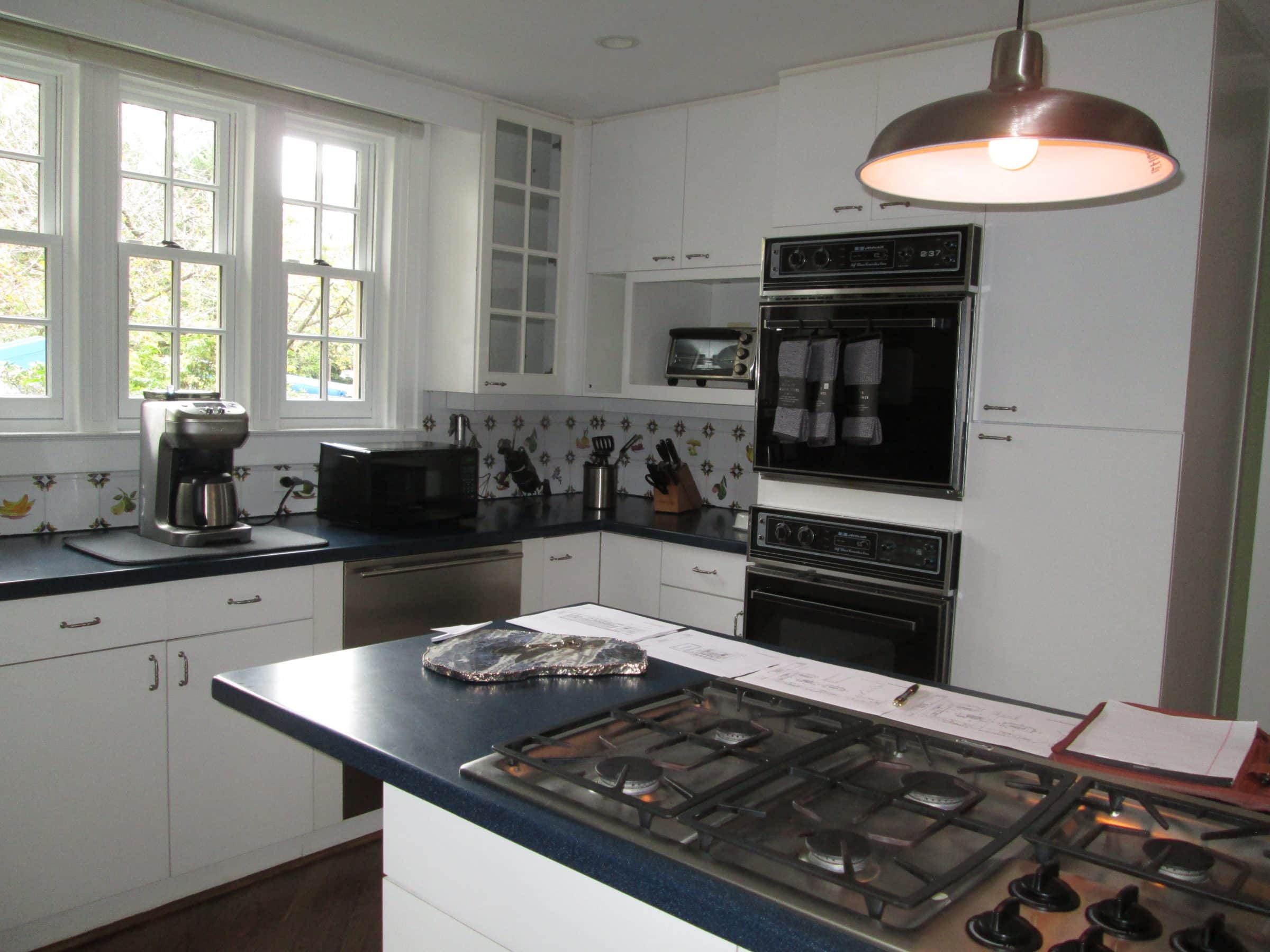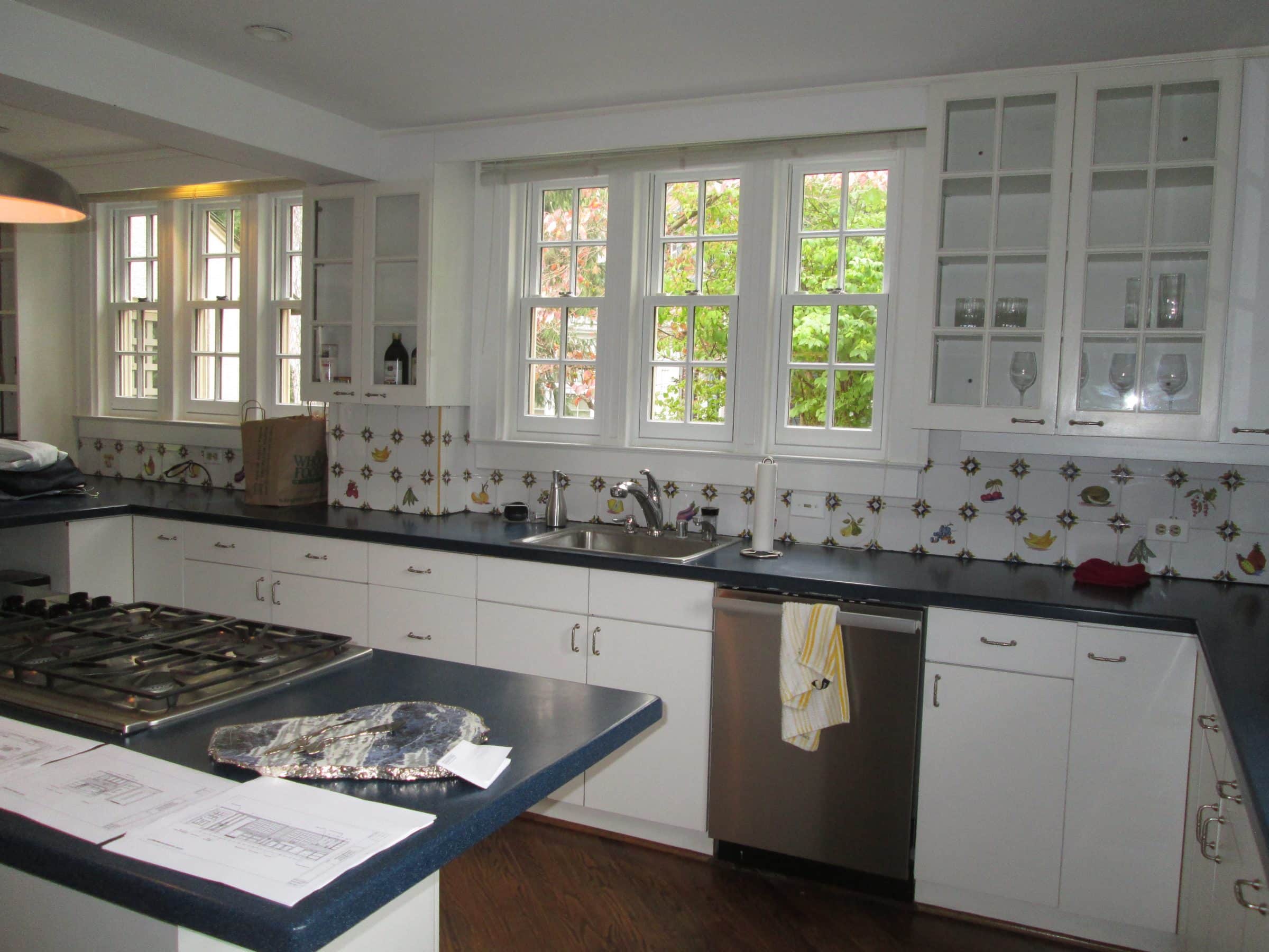 Take a look at the before and after photos and you will be amazed at the revitalized kitchen in this 1925 Baltimore City home. The busy fruit and vegetable ceramic tile backsplash GONE, the dark blue Corian tops GONE, the wasted space GONE. In its place, we see clean, cool, crisp kitchen design and bright white components with an efficient space plan and updated appliances to please the most discriminating taste.