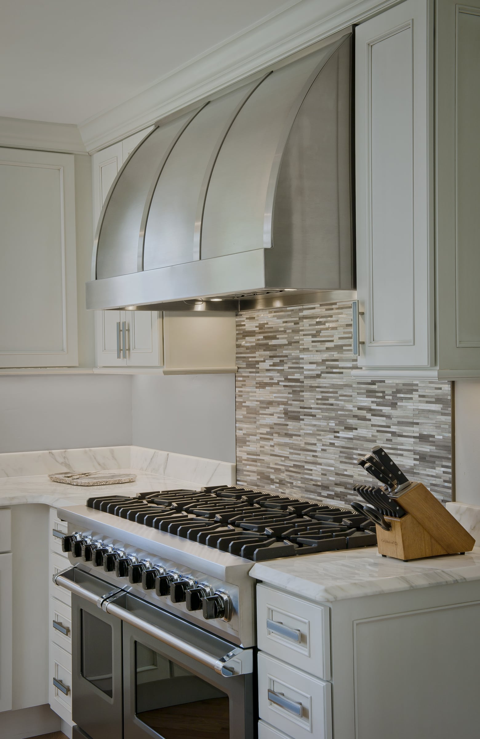 This Roland Park kitchen remodel boasts beautiful Calacatta Supreme Extra Marble countertops on the perimeter and double island giving this kitchen a clean and bright appearance. Stainless steel appliances, including the Viking side by side refrigerator, bring a light reflective and industrial look. The homeowners love to entertain and cooking is a serious matter. A custom made stainless steel exhaust hood was crafted to meet their exact specifications by Handcrafted Metals and was installed over their commercial Viking stove. Another important addition to their newly remodeled kitchen is a full-size Eurocave Wine Cooler to keep refreshing beverages at hand for entertaining guests. Each element of this beautiful remodel was selected for ease of function incorporating the best kitchen appliances.