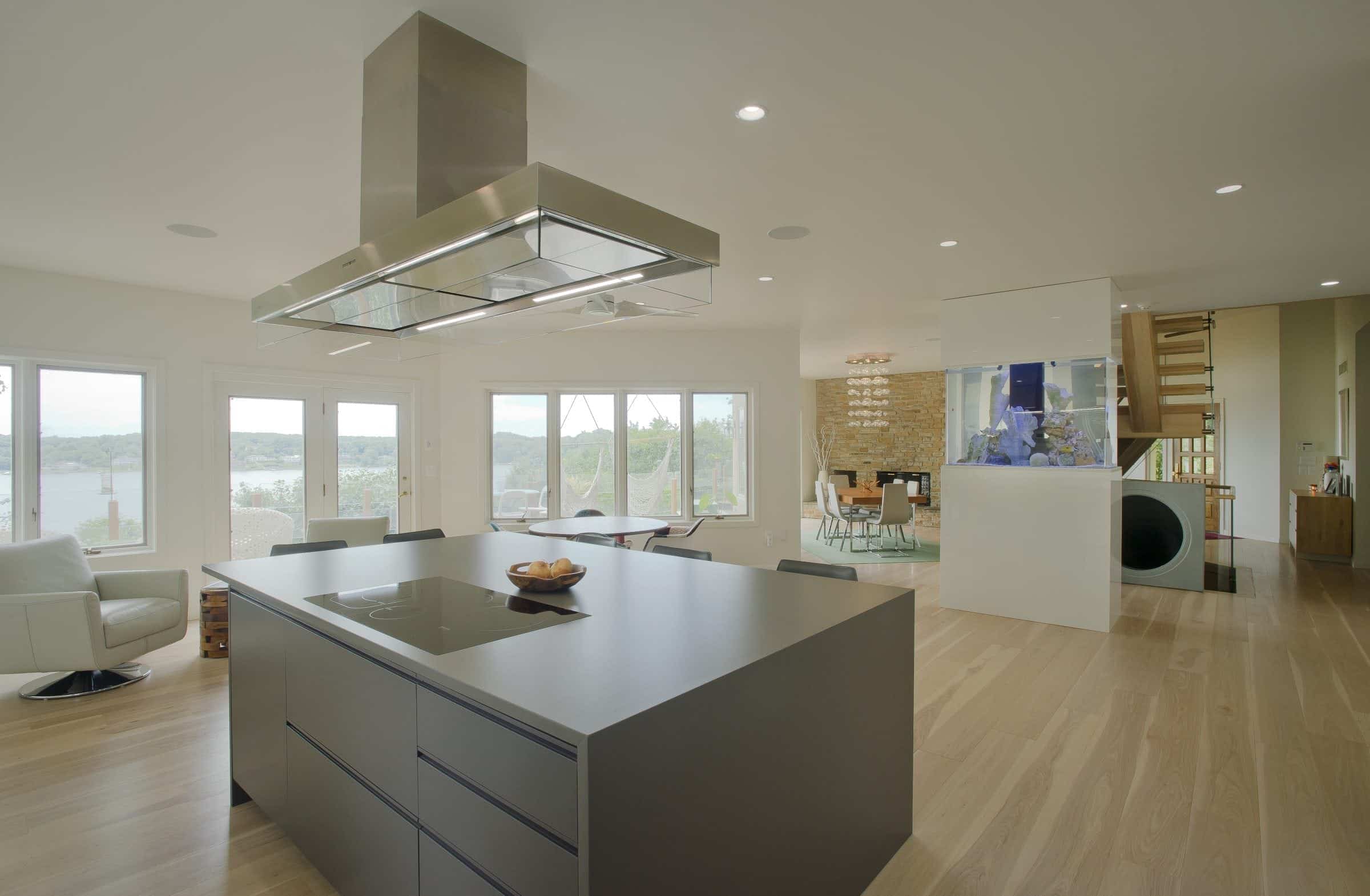 - Appliances? A cooktop incorporated in an island can offer the chef a clear view of the rest of the room and allow for visiting with guests while preparing the meal. There will be a need for ventilation so a hood that suspends from the ceiling over the island can be considered, but it will somewhat block the view. You could also opt for a built-in exhaust vent that pops up at the push of a button from within the underlying cabinet.