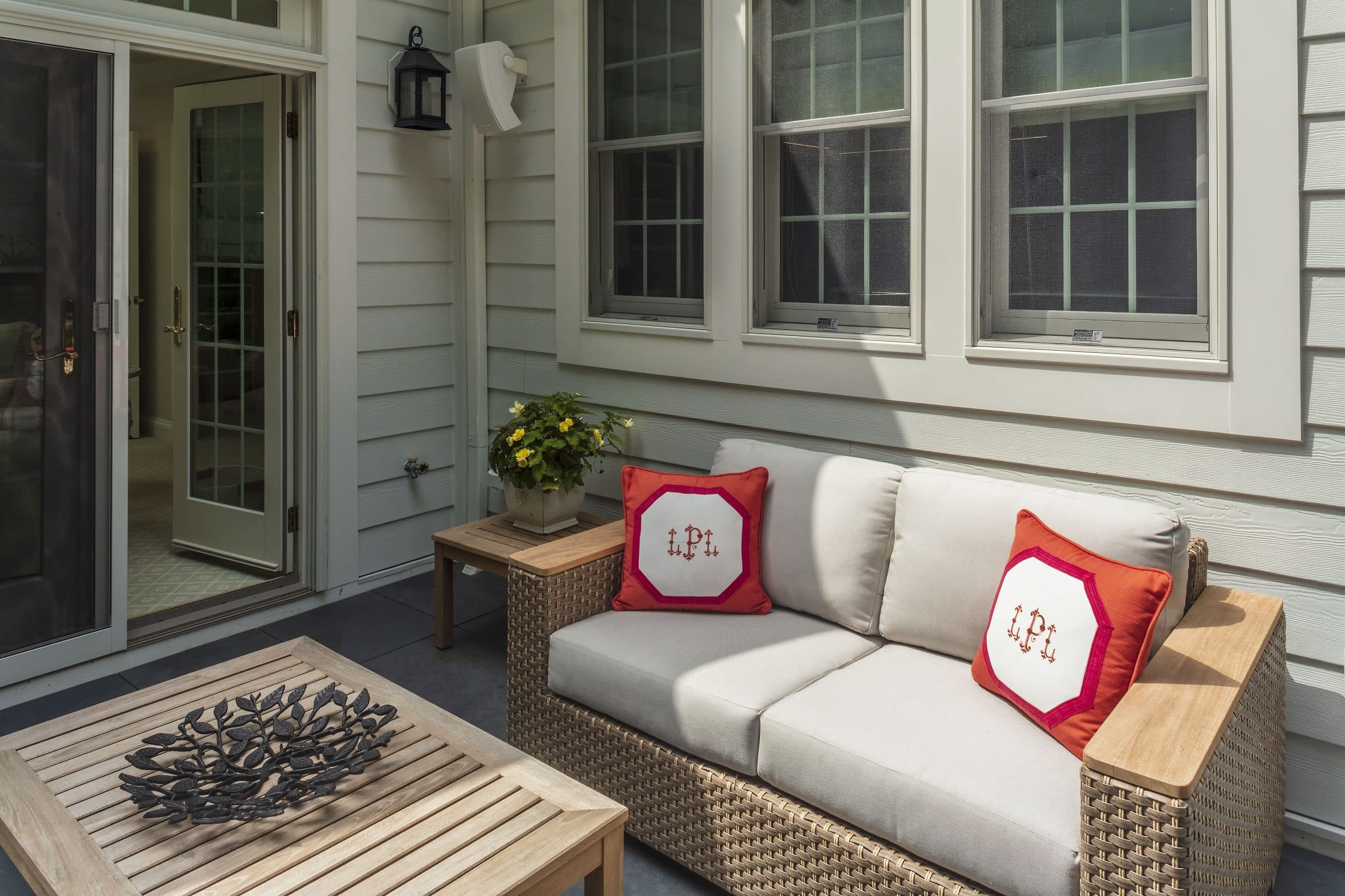 - The outdoor living space off the sitting room is accessed through French doors and has a retractable awning allowing for shade or outdoor sunbathing.