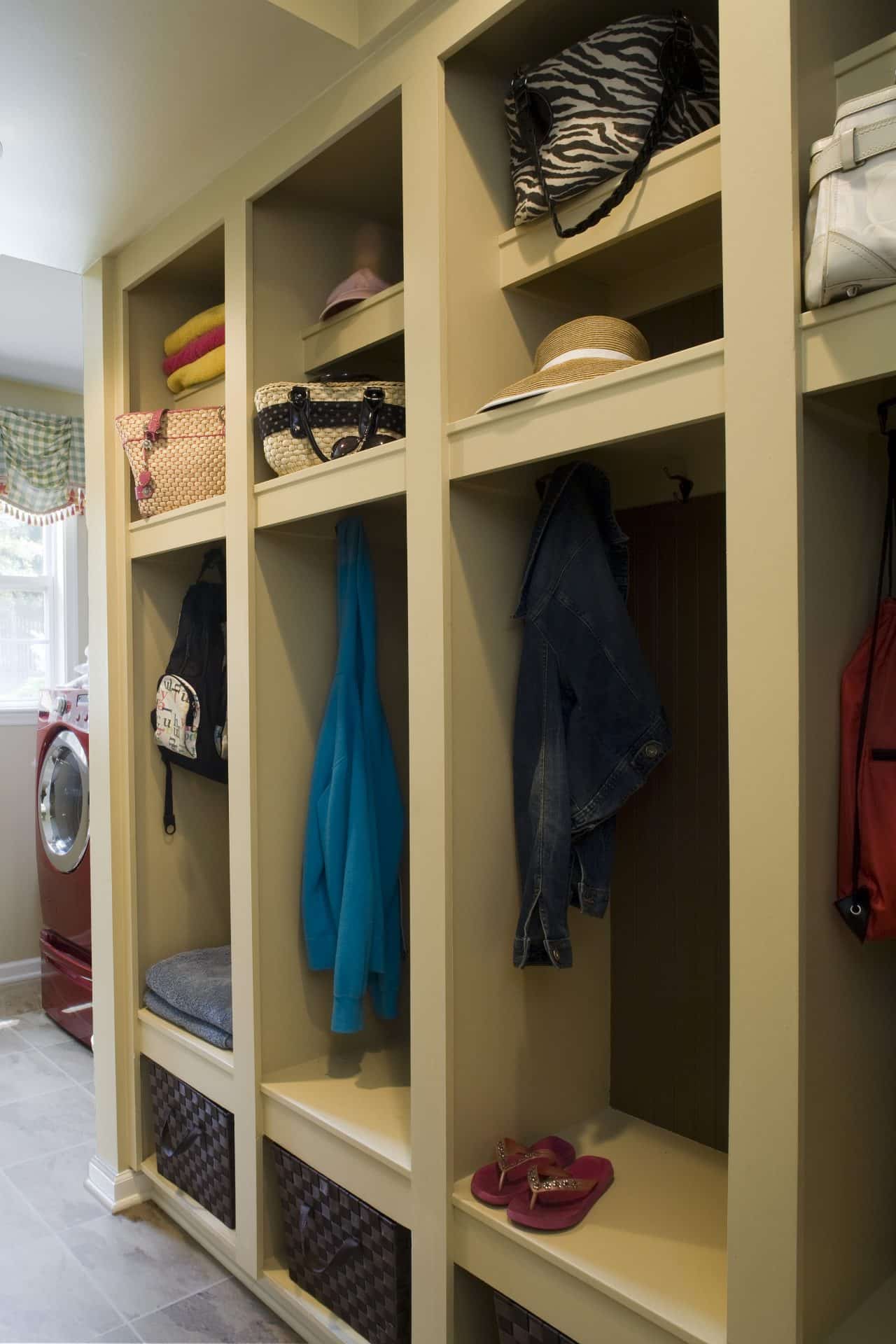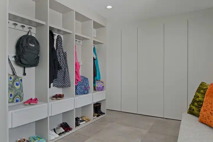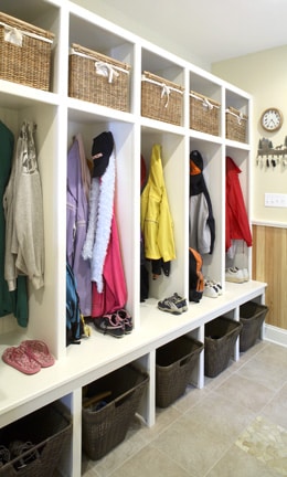 Mudrooms are great to have in your home as the point of entry to trap all the dirt, snow, and rain that accumulates on shoes and boots. Having resilient flooring is imperative. Also, a great place to store wet outer clothing such as jackets, coats, hats, and gloves to dry. You may want to consider placing your laundry room in the mudroom area or adjacent to it to offer ease in laundering wet and muddy items. We make custom organization systems for any room in the house and will share a few designs in this article.
