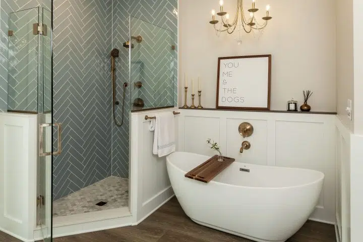 Bright white cabinetry becomes light reflective surfaces. The beautiful blue herringbone tile backsplash coordinates with the wall tile in the walk-in shower bringing tranquility to the bathroom. Plenty of counter space for this double sink vanity offers storage for all their personal products as well as towels. Adding to the warmth of this new retreat-like bathroom are the Kohler brushed bronze hardware, faucets, and sconces. They coordinate well with the Revwood wood-style waterproof flooring creating a soothing experience.