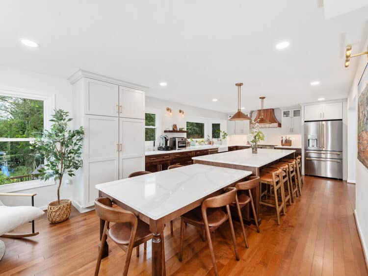 This Ellicott City expanded and remodeled kitchen transformed a standard 1980s layout into a bright, open space designed for modern living and effortless entertaining. By removing the wall between the kitchen and dining room, we completely reimagined the floor plan, creating a seamless flow that feels both expansive and inviting. What was once a series of separated rooms is now a connected, light-filled hub where cooking, dining, and gathering naturally come together.