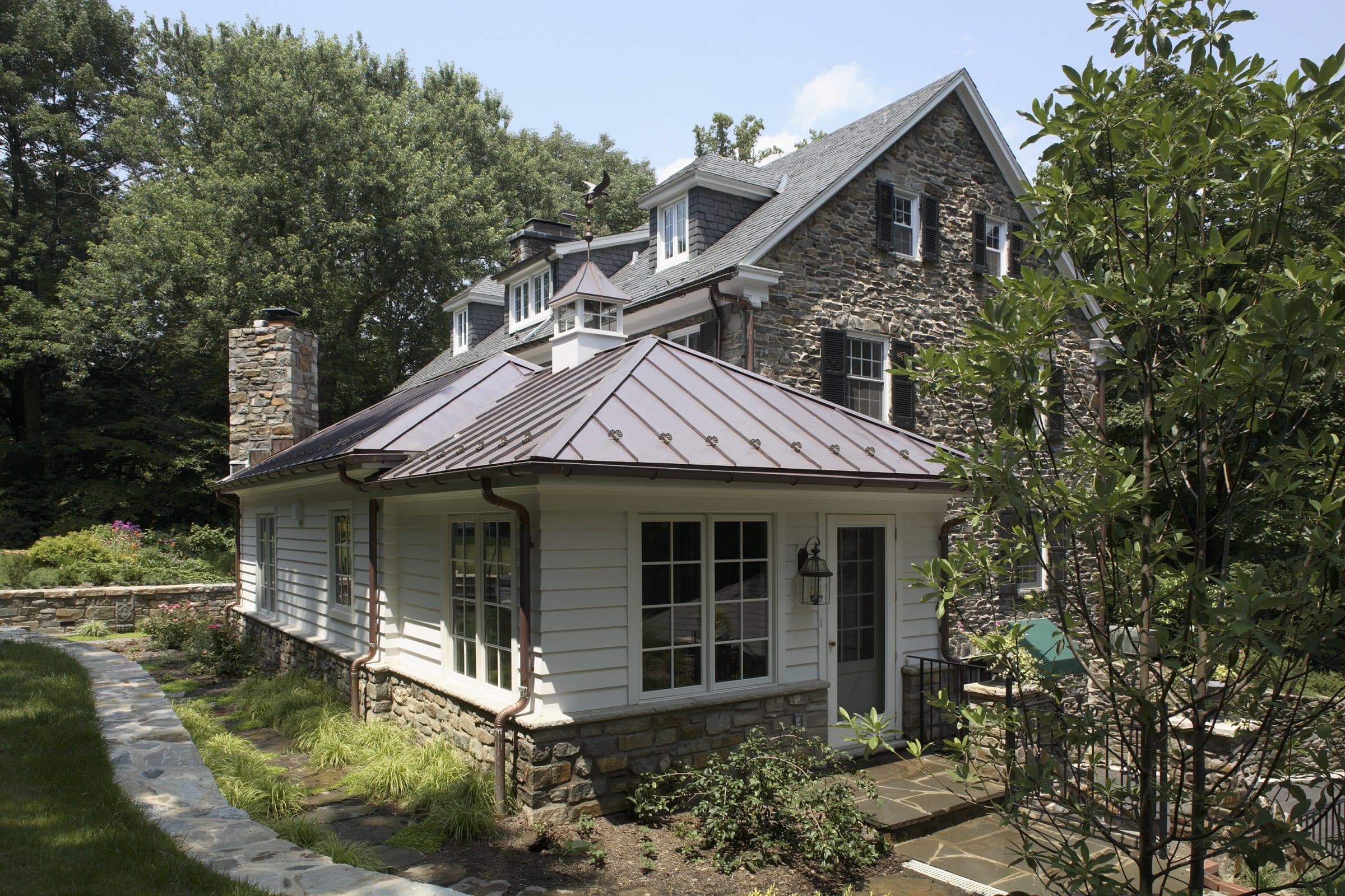 Their wish was to create a kitchen addition that would be a compliment to the home in both its exterior elements and the hardscape surrounding the addition. The overwhelming presence of natural stone motivated this homeowner to accent the addition to echoing and replicate that element, but not construct the entire addition in stone.