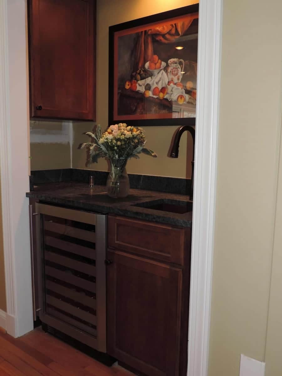 The second project they chose was a kitchen update and new bar area in the living room. The home bar has a GE Monogram under counter beverage refrigerator, bar sink and Koch cabinet with soapstone counter top. Entertaining guests is much easier and more efficient. Koch cabinetry was also installed in the kitchen along with Blue Flower Granite counter tops and GE Monogram appliances. The beautiful Baroque engineered wood floor runs throughout the first floor and gives the addition and existing space uniformity.