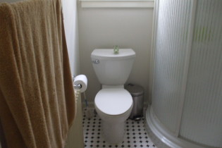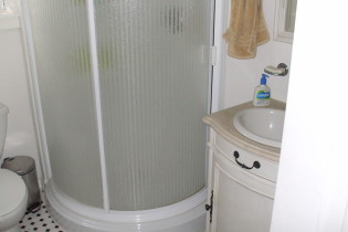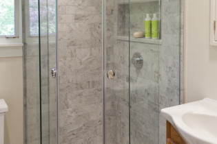 An example of an update for a small bathroom space is shown below. Notice that the corner shower has a contemporary look with 22” x 76” glass doors attached to industrial type hanging roller clamps giving the bathroom a very minimalist and clean look. The two glass panels 22” x 76” were custom made and sealed to the walls by clear silicone.