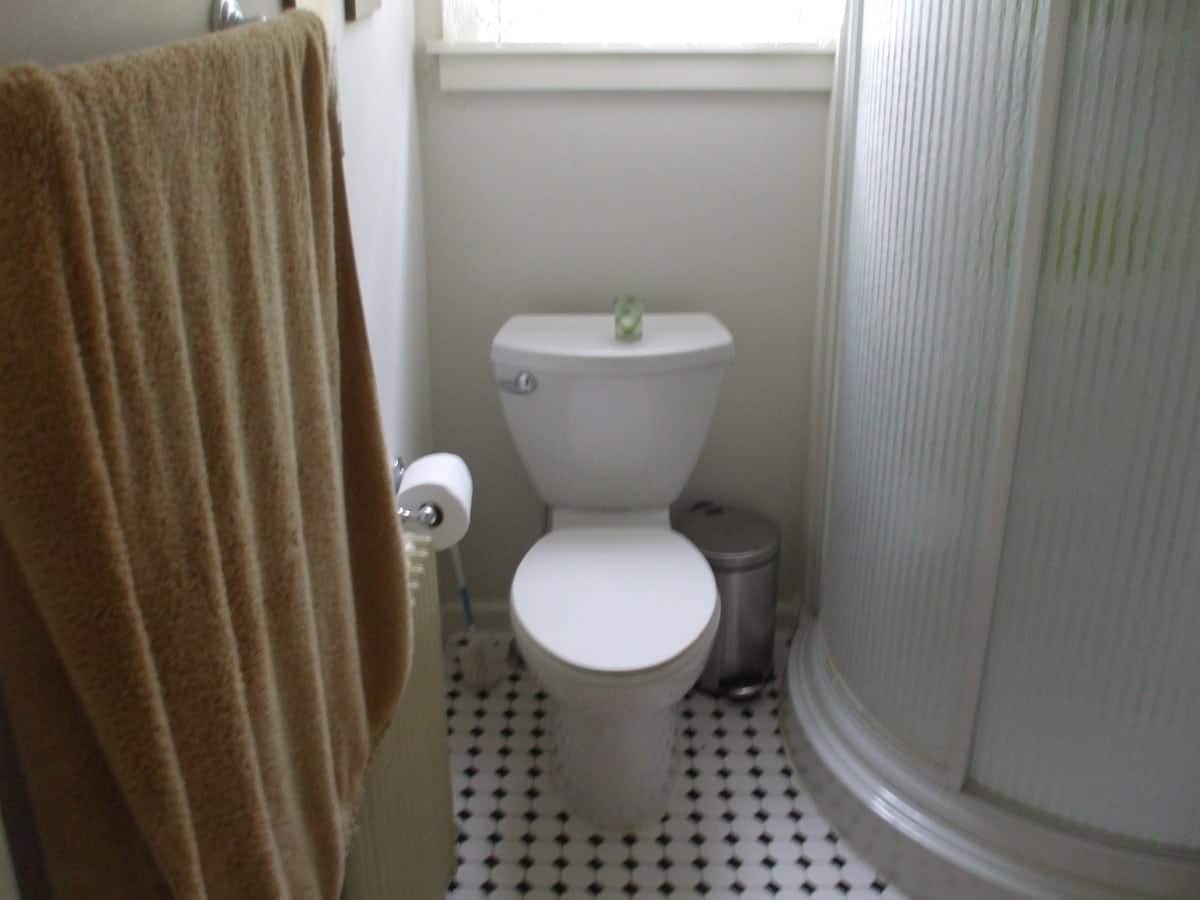 What makes this shower design, so workable, in this tiny bathroom is the 90 degree corner opening where both sliding glass doors meet. This eliminates the swing of a door, which is impossible in this size space, and also allows for room on each side of this shower for the necessary commode and sink.