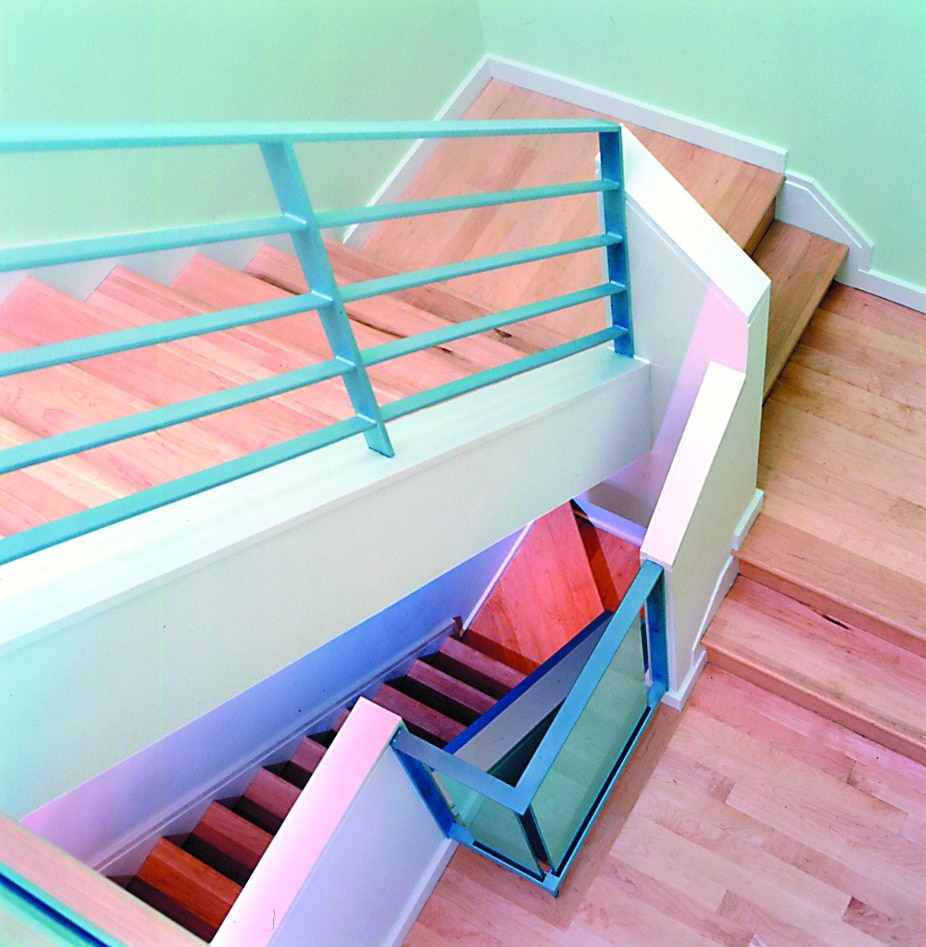 - A traditional stairway with white painted wood balusters and risers, stained banister and treads are given a more modern look as it floats from the foyer to the second floor.