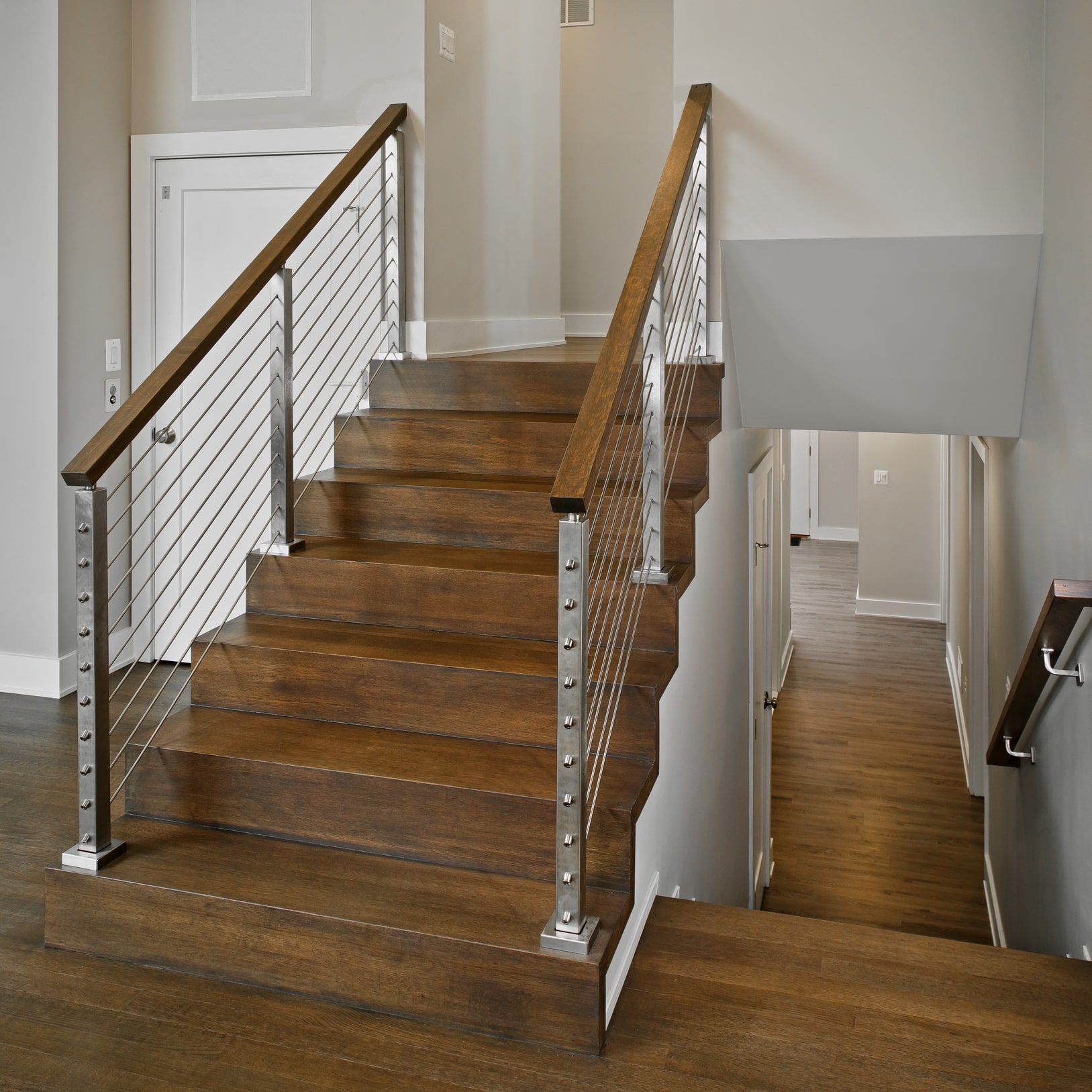 This style railing system was usually found in the outdoor stairway but has now trended into the interior staircase often used in the contemporary design. The thin cable or metal tube creates clean lines when horizontally installed and gives a sleek look appealing to the modern style. Popular in city settings especially lofts and condos by lending itself to maximizing viewing and opening up small closed spaces.