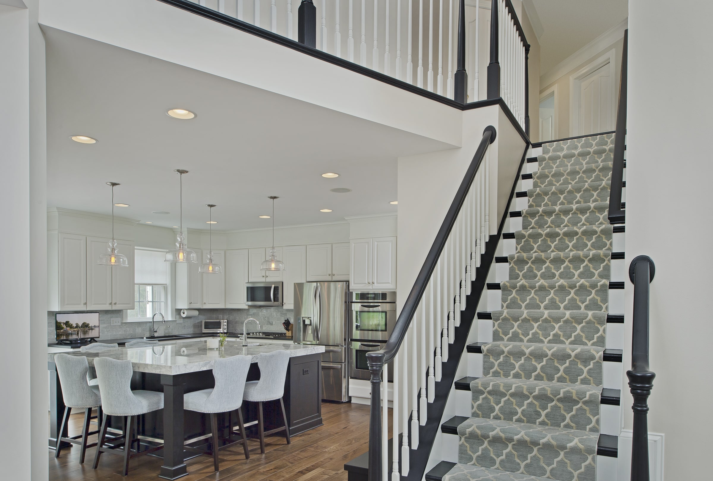 The first floor was first on the list. A sunken family room is not conducive to open floorplans nor is a very awkward staircase to the second floor. Walking in the front door guests were greeted by a set of stairs with landing that just didn’t make sense. Very close by this staircase was the drop-off into a sunken family room. Another obstacle to an open concept was a partial wall separating the family room from the kitchen. This inhibited the family from socializing and communicating when everyone was home. Between the semi wall dividing the two spaces and the sunken design you weren’t able to see one another.