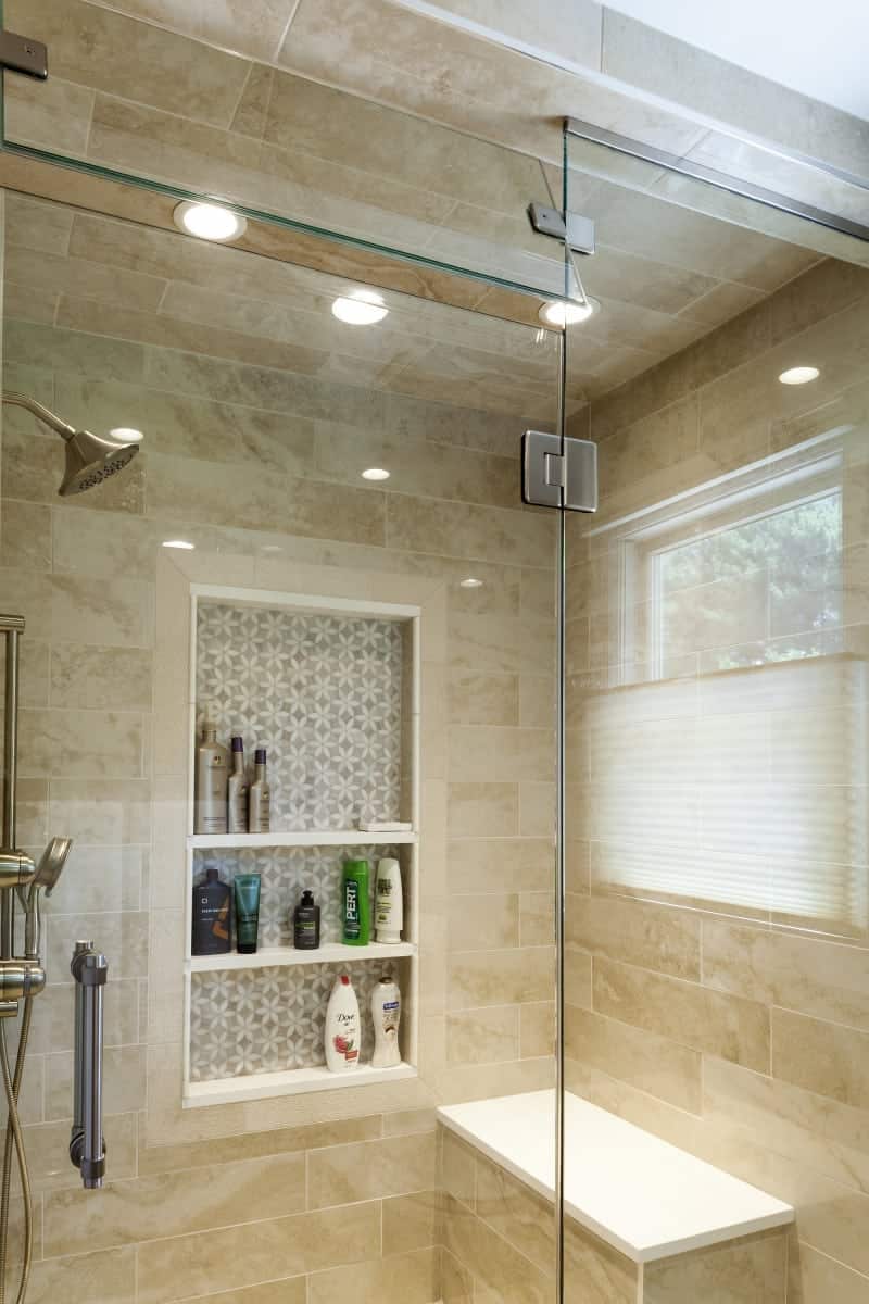 The hall bath was also updated with a beautiful vanity by Dura Supreme, a Caesarstone Pure White Top and a luxurious steam shower by Kohler. The ceramic tile is by Daltile in Crosscut Bone and the beautiful niche is AEC London Calling Cloud & Mist tile. This update allows the homeowners to enjoy a large walk in shower in the master with a steam shower for him nestled in the hall bath. The best of both worlds!