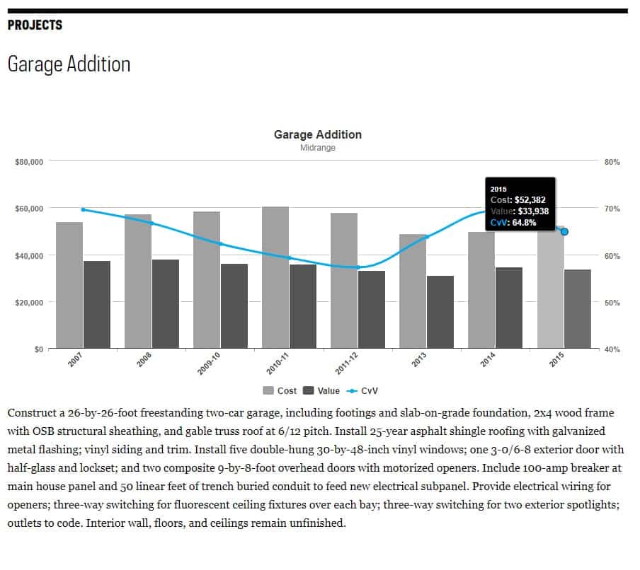 Several things when building a garage impact the cost of your investment such as; size, attached or detached, single or double car, the location of the present driveway and whether it will be a one or two story garage addition. These decisions will affect your building costs and should be carefully considered as you plan your budget. Another very important consideration is zoning laws for your neighborhood. They will restrict what and how you can build on your property in relation to property lines. The most updated Cost vs. Value Report below was created in 2015 for Garage Additions without a second floor and stats for 2018 will be different. This report reveals the investment comparison over the years from 2007 to 2015 and the estimated value at resale. The information is based on region and whether the addition is upscale (finished interior) or midrange(unfinished interior) in value and without a second floor. A good research tool for homeowners because it aids in setting a reasonable budget for your addition and estimates the recoup of your investment when you sell. Remember to consider the number of years you plan to stay in the home as this will also factor into the decision whether a garage addition is the best investment for you.